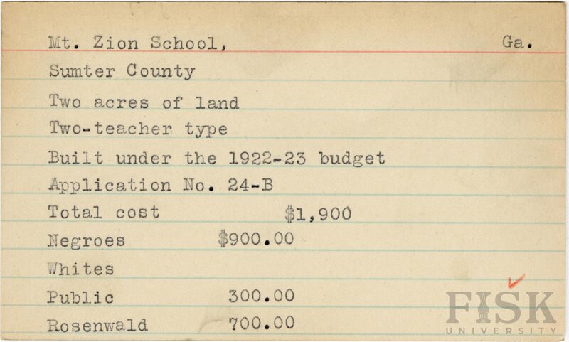 - School card from Rosenwald Fund for Mt. Zion School in Sumter County, Georgia