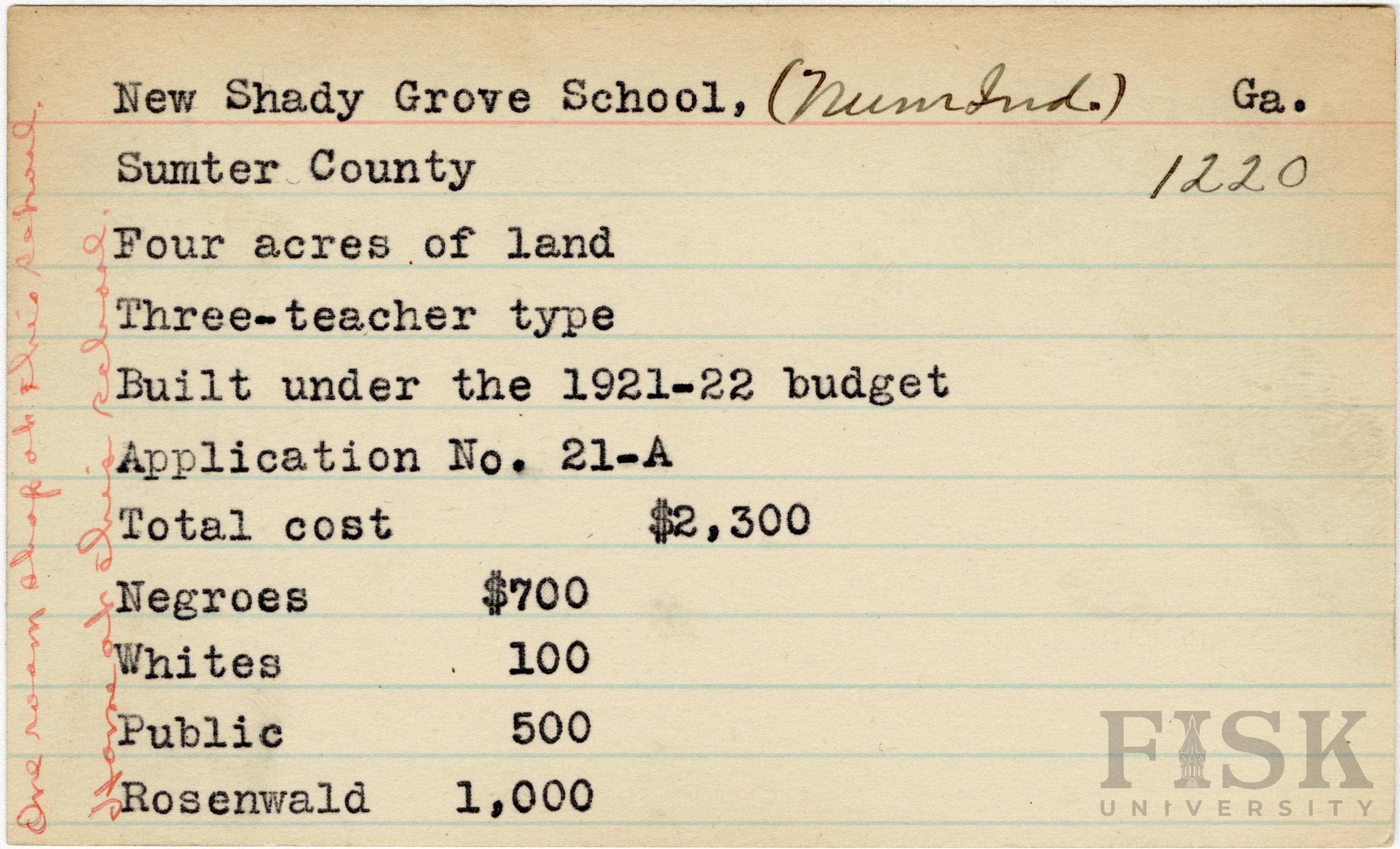 School card from Rosenwald Fund for New Shady Grove School in Sumter County, Georgia with handwritten notes on the far left of the card that say "One room shop at this school" and "Home at this school"
