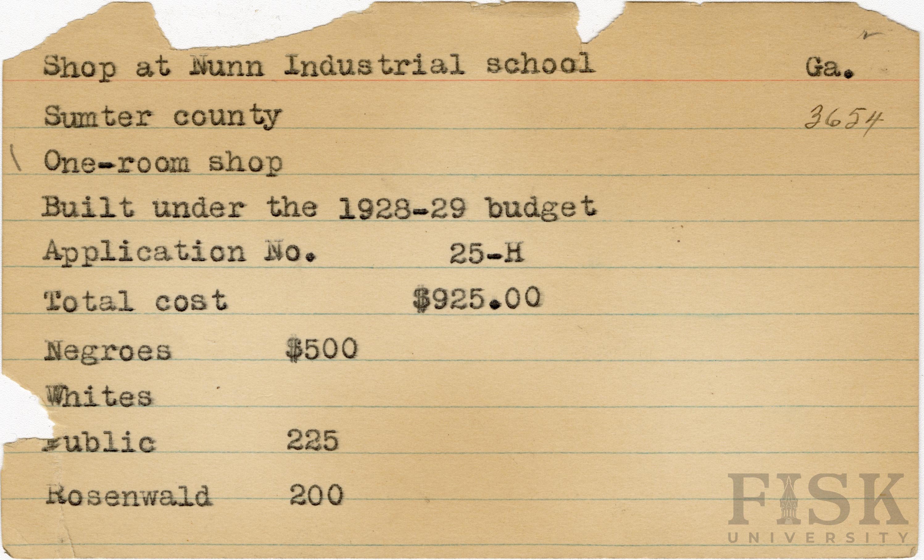 School card from Rosenwald Fund for the one-room shop at New Shady Grove School in Sumter County, Georgia
