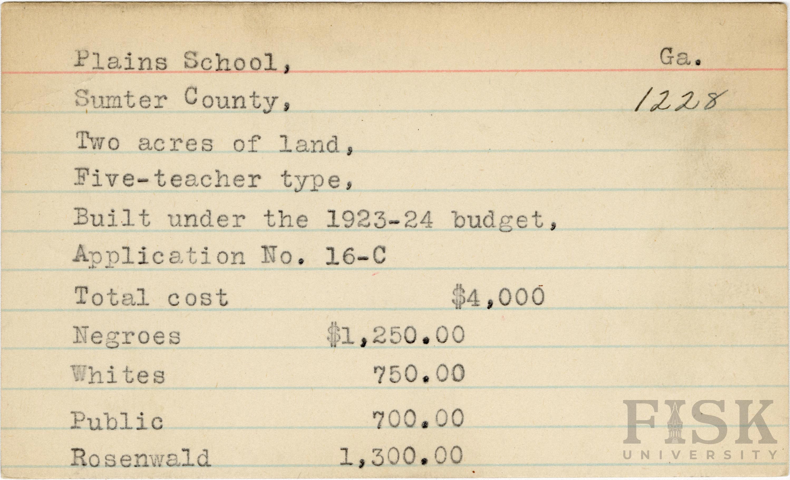 - School card from Rosenwald Fund for Plains School in Sumter County, Georgia