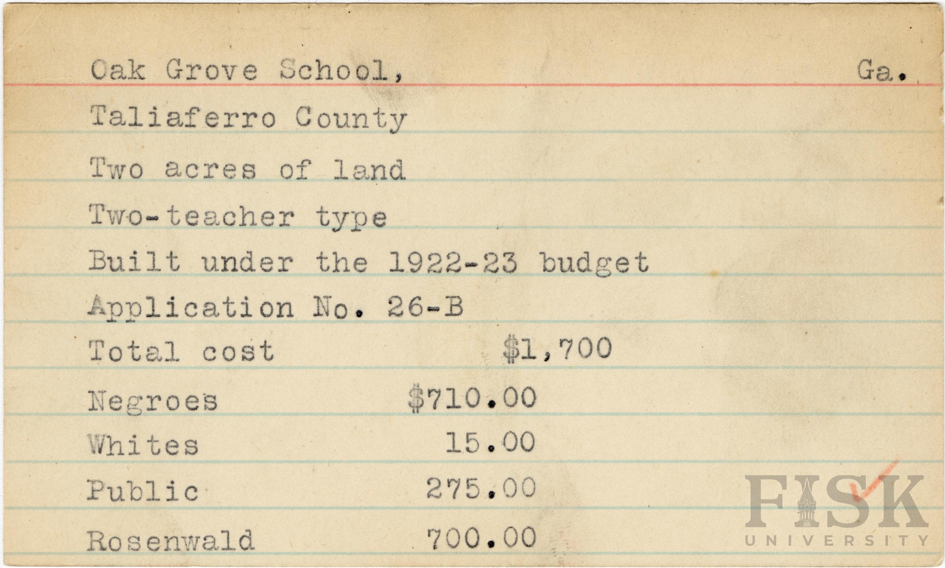 - School card from Rosenwald Fund for Oak Grove School in Taliaferro County, Georgia