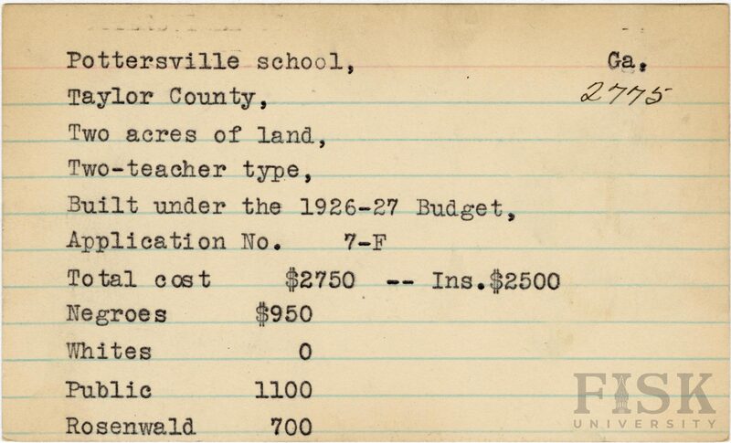 - School card from Rosenwald Fund for Pottersville School in Taylor County, Georgia with a section added to the budget contributions that says, "Ins. $2,500"