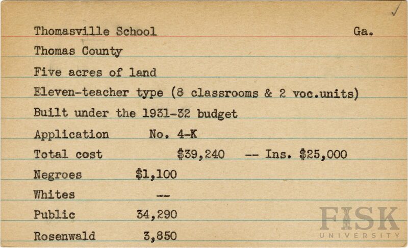 - School card from Rosenwald Fund for Thomasville School in Thomas County, Georgia with a section added to the budget contributions that says, "Ins. $25,000".