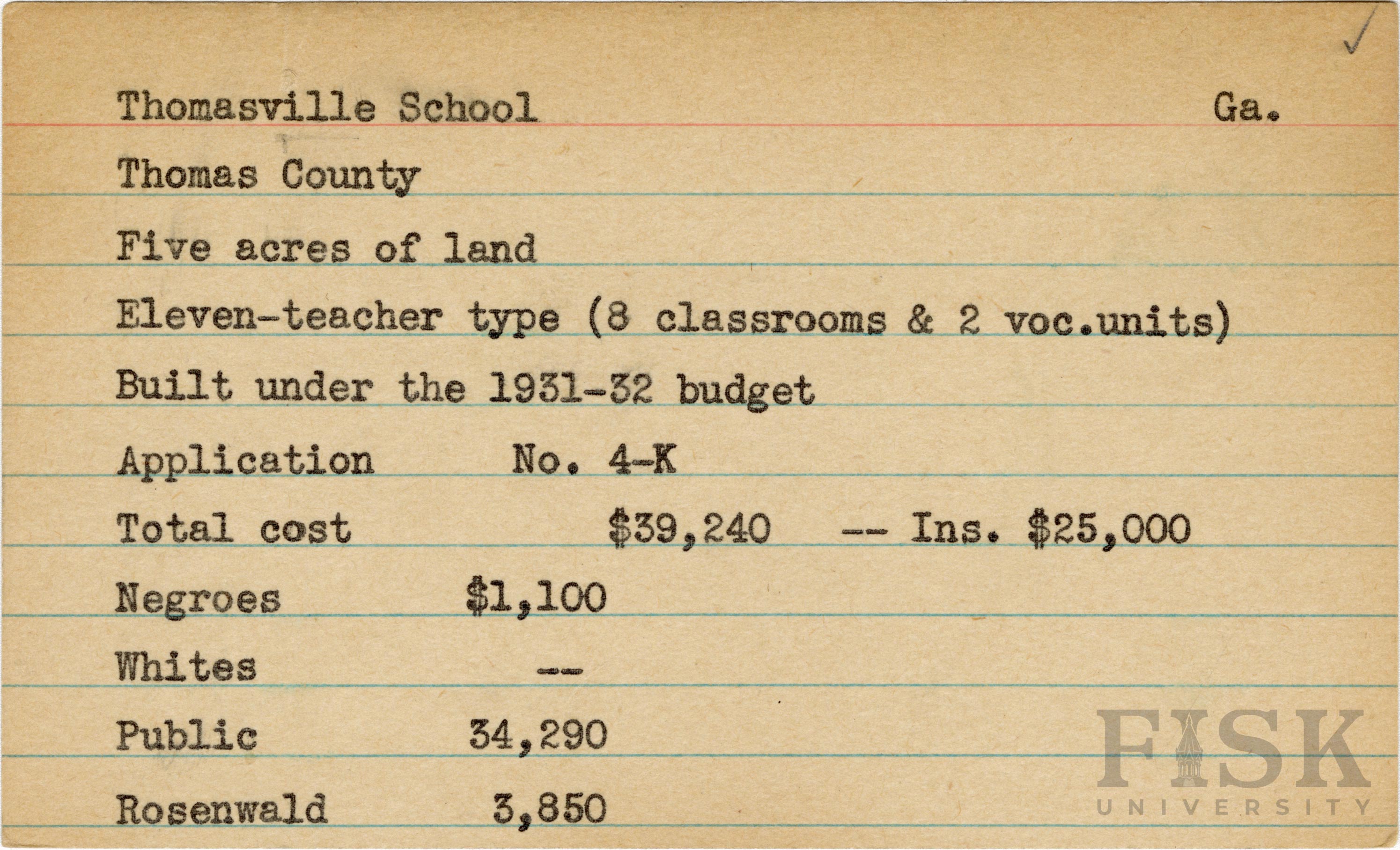 School card from Rosenwald Fund for Thomasville School in Thomas County, Georgia with a section added to the budget contributions that says, "Ins. $25,000".