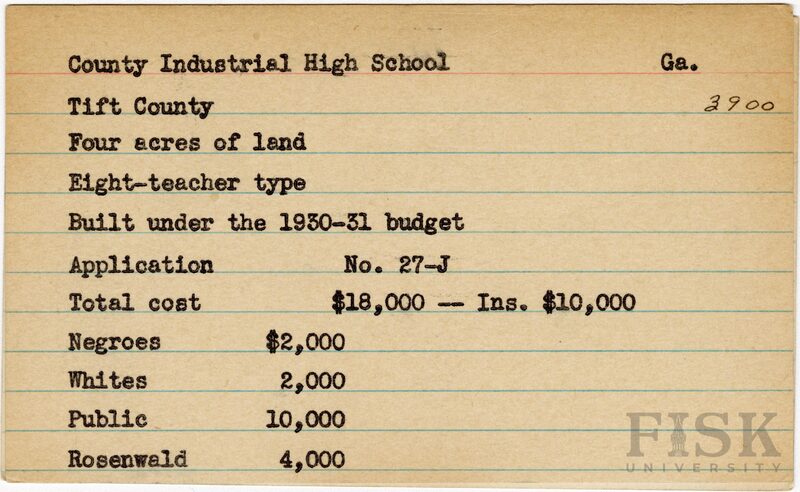 - School card from Rosenwald Fund for County Industrial High School in Tift County, Georgia with a section added to the budget contributions that says, "Ins. $10,000"