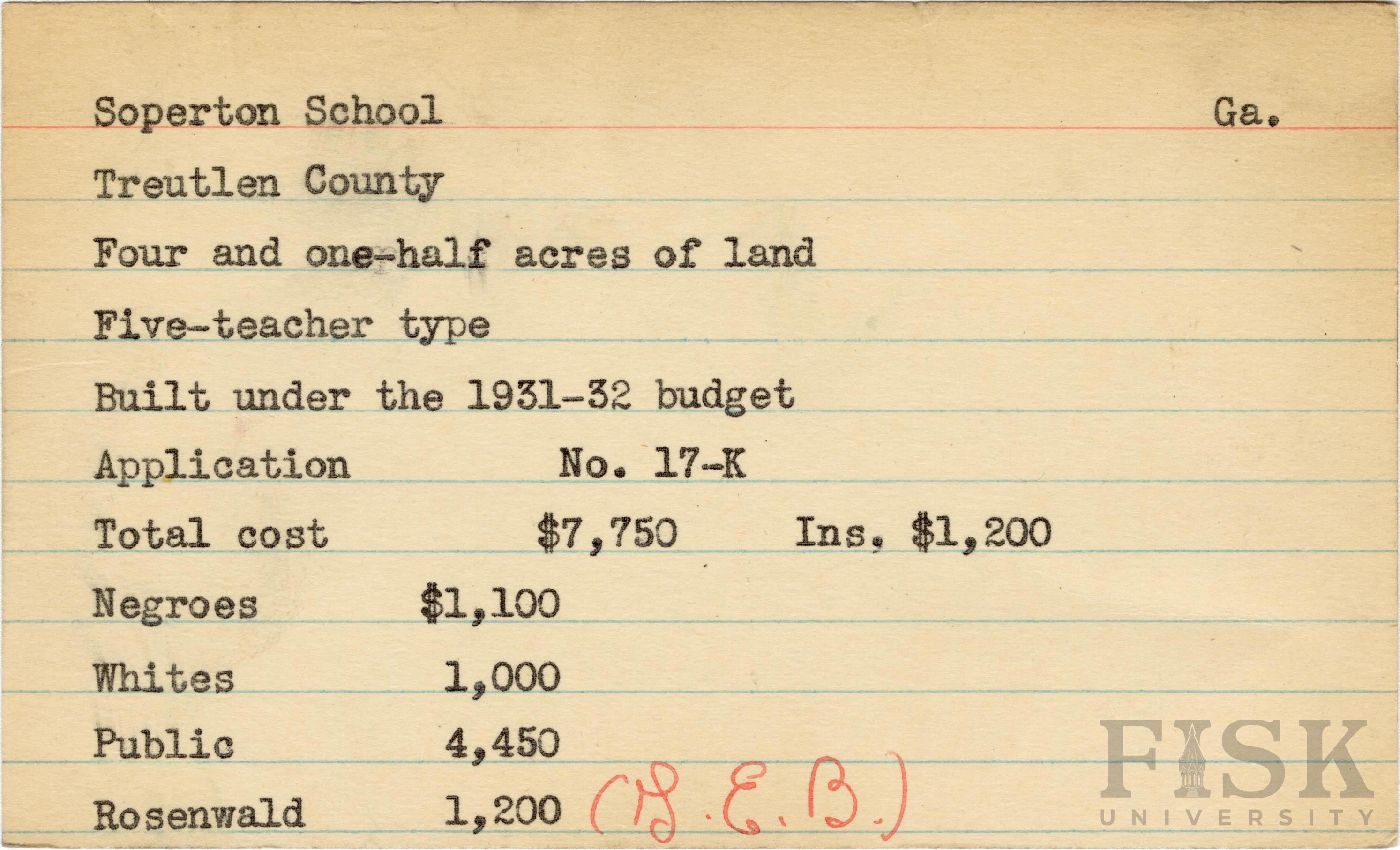 School card from Rosenwald Fund for Soperton School in Treutlen County, Georgia with a section added to the budget contributions that says "Ins. $1,200" and a handwritten note next to the Rosenwald budget contribution that says, "(G.E.B.)"