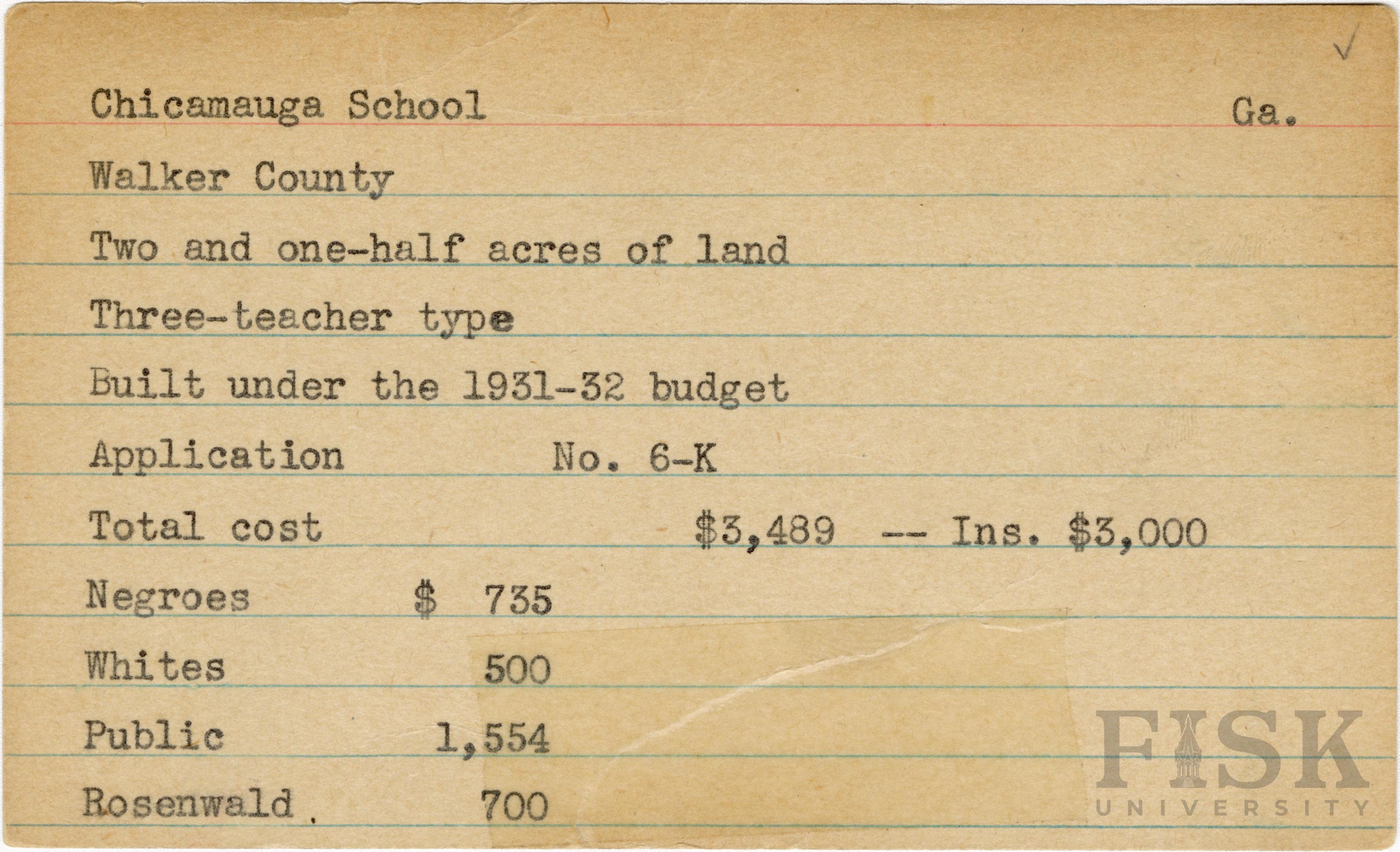 School card from Rosenwald Fund for Chicamauga School in Walker County, Georgia with a section added to the budget contributions that says, "Ins. $3,000"