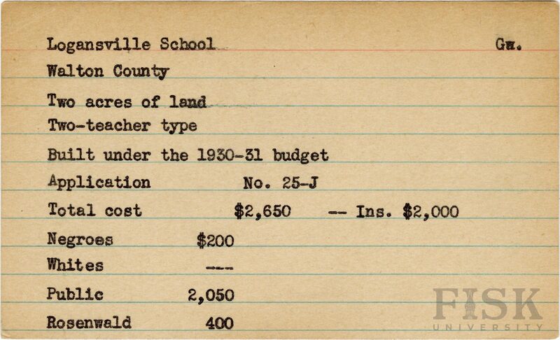 - School card from Rosenwald Fund for Logansville School in Walton County, Georgia with a section added to the budget contributions that says, "Ins. $2,000"