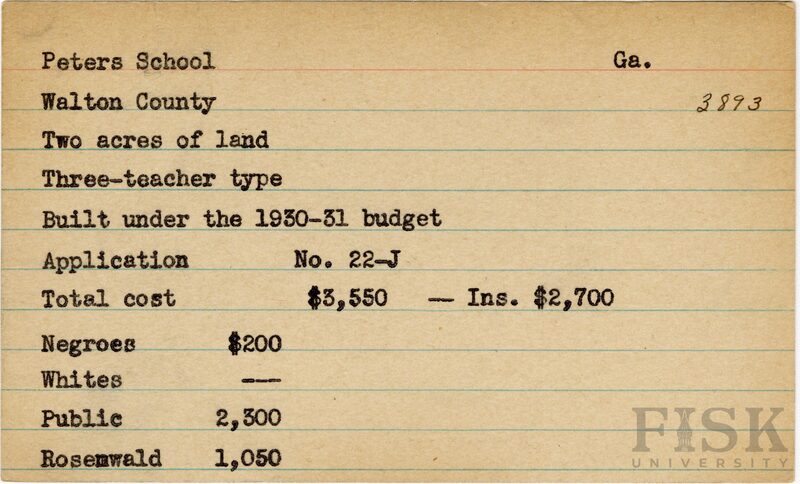 School card from Rosenwald Fund for Peters School in Walton County, Georgia with a section added to the budget contributions that says, "Ins. $2,700"