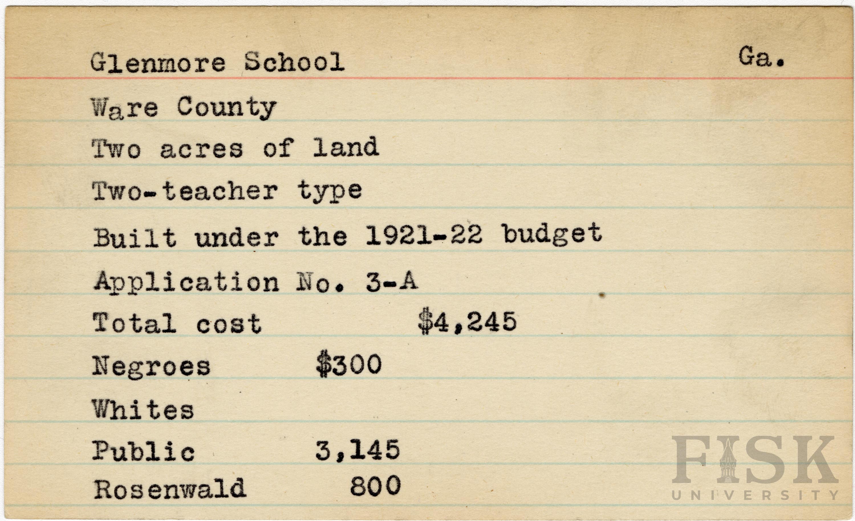 - School card from Rosenwald Fund for Glenmore School in Ware County, Georgia