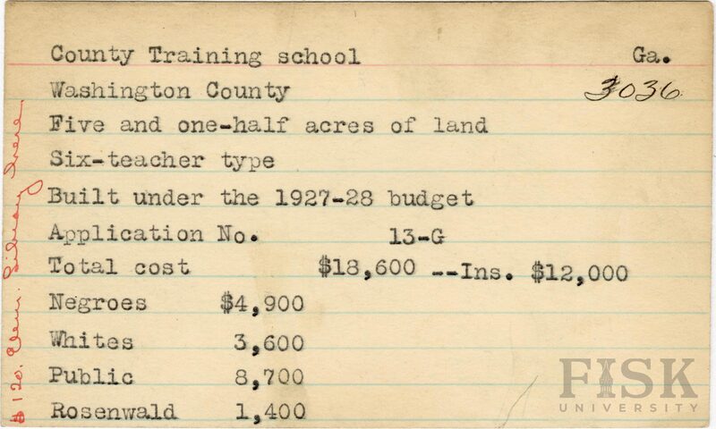 - School card from Rosenwald Fund for County Training School in Washington County, Georgia with a section added to the budget contributions that says, "Ins. $12,000" and a handwritten note on the far left of the card that says, "$120 elem library here"