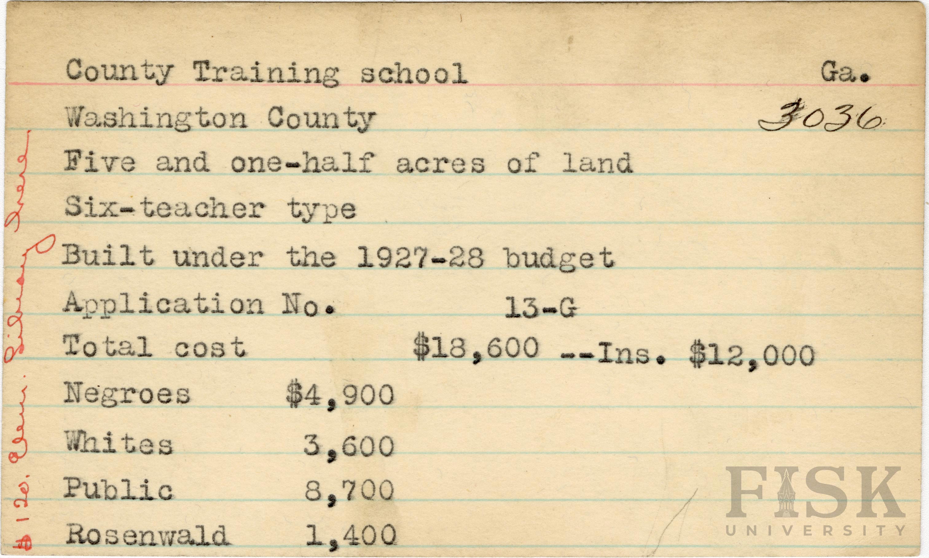 School card from Rosenwald Fund for County Training School in Washington County, Georgia with a section added to the budget contributions that says, "Ins. $12,000" and a handwritten note on the far left of the card that says, "$120 elem library here"