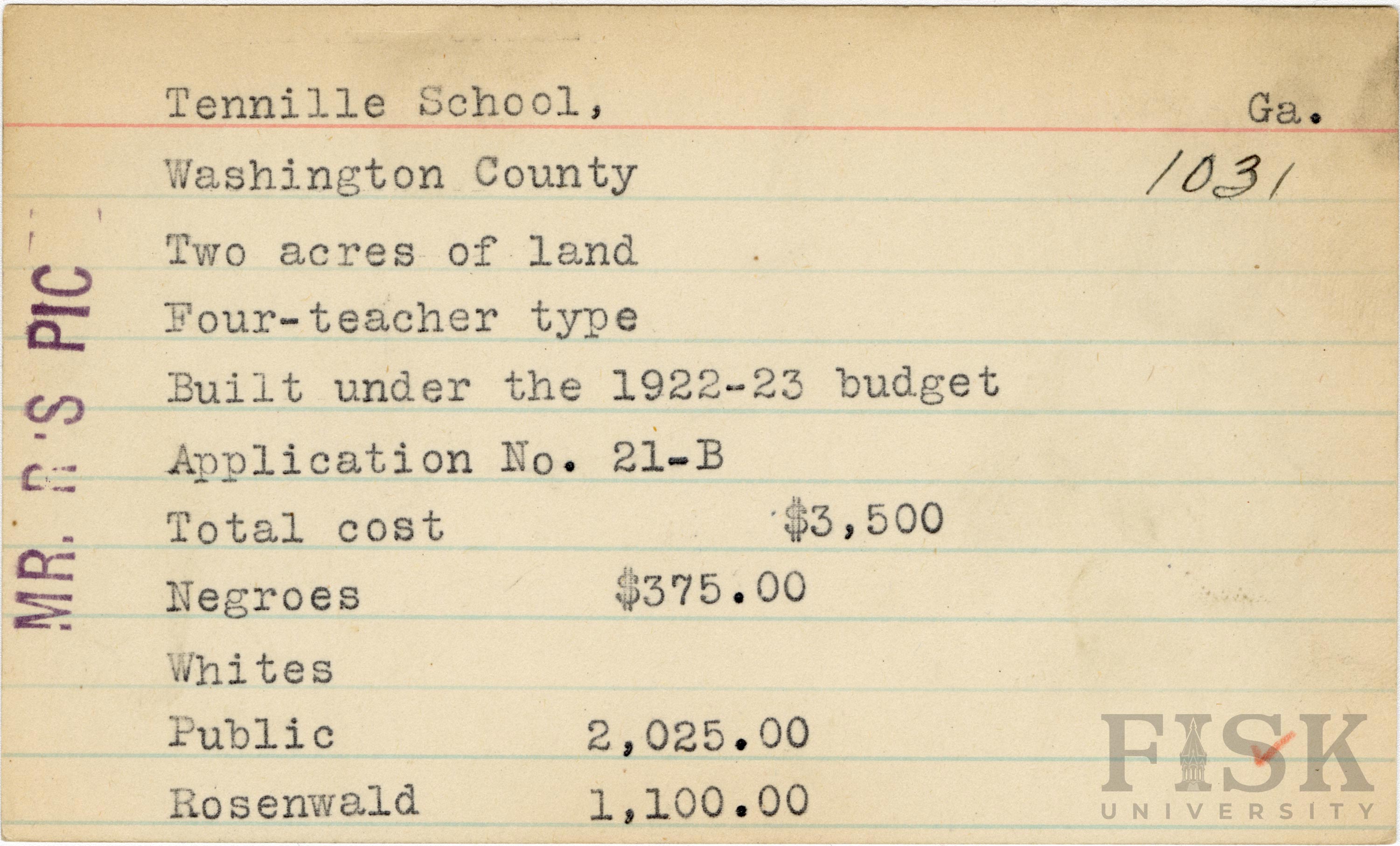 School card from Rosenwald Fund for Tennille School in Washington County, Georgia with a note on the far left of the card that says, "Mr. R's Pic"