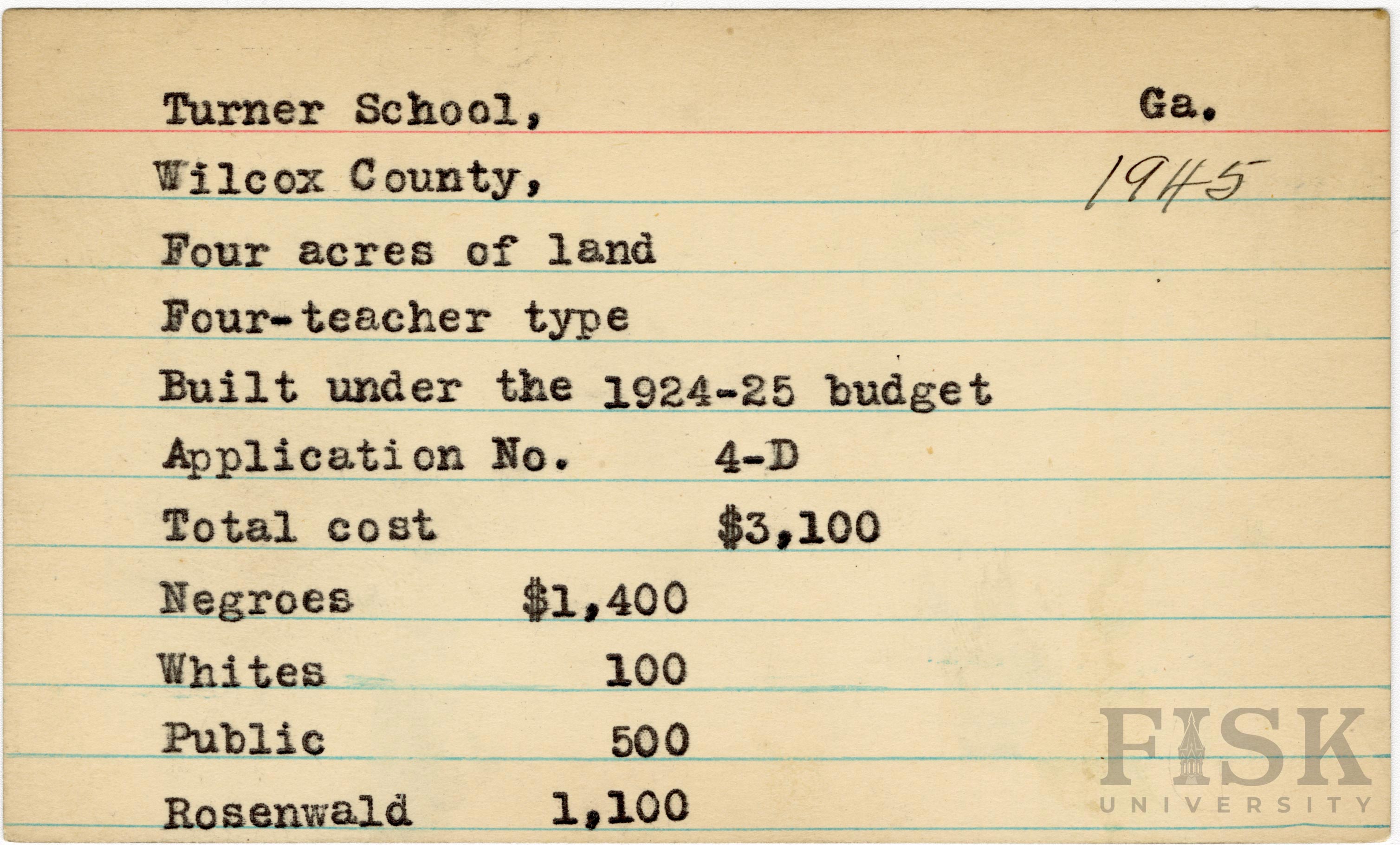 - School card from Rosenwald Fund for Turner School in Wilcox County, Georgia