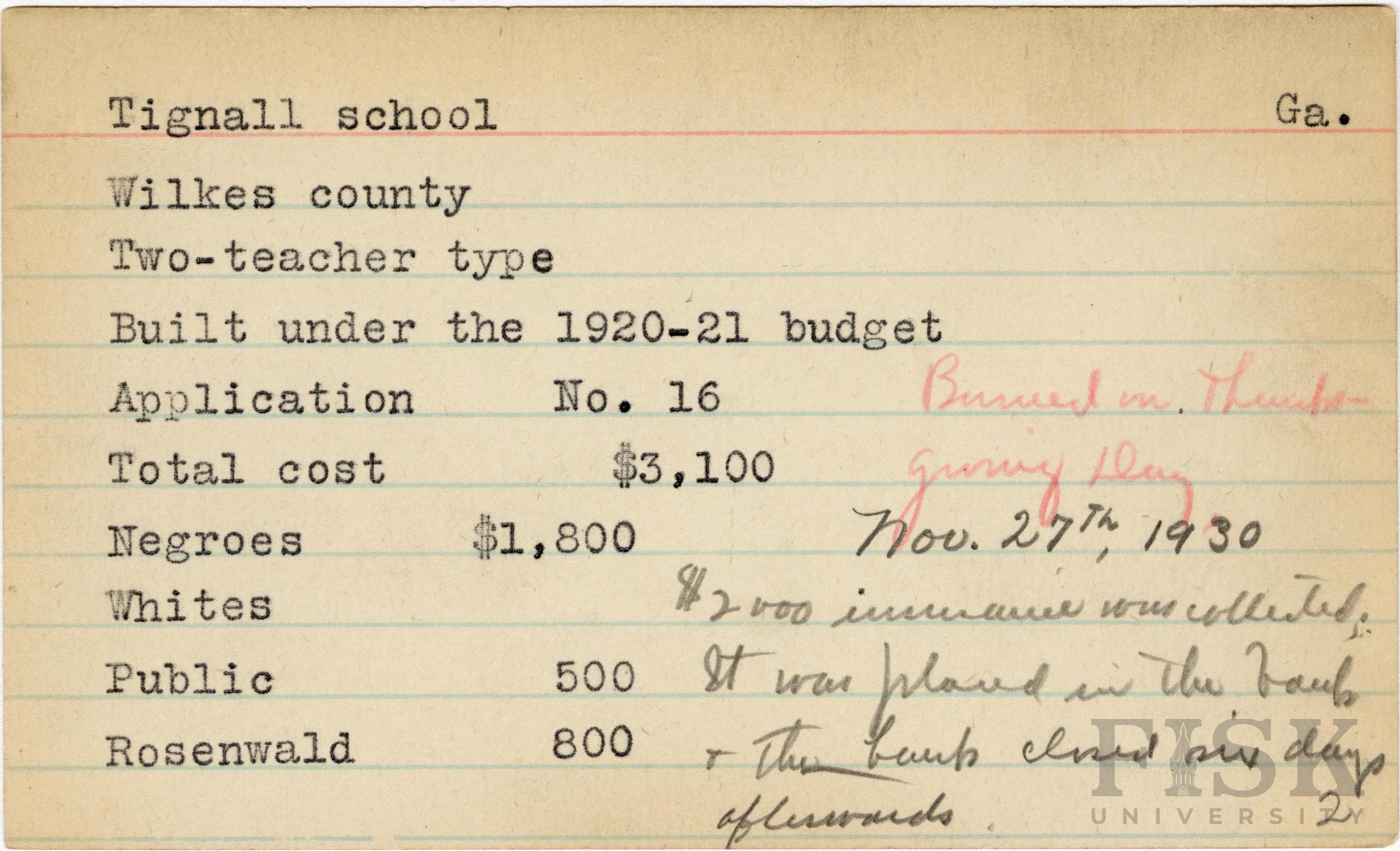 School card from Rosenwald Fund for Tignall School in Wilkes County, Georgia with handwritten notes that say, "Burned on Thanksgiving Day", "Nov 27th, 1930", and "$2,000 insurance was collected. It was placed in the bank and the bank was closed six days afterwards"