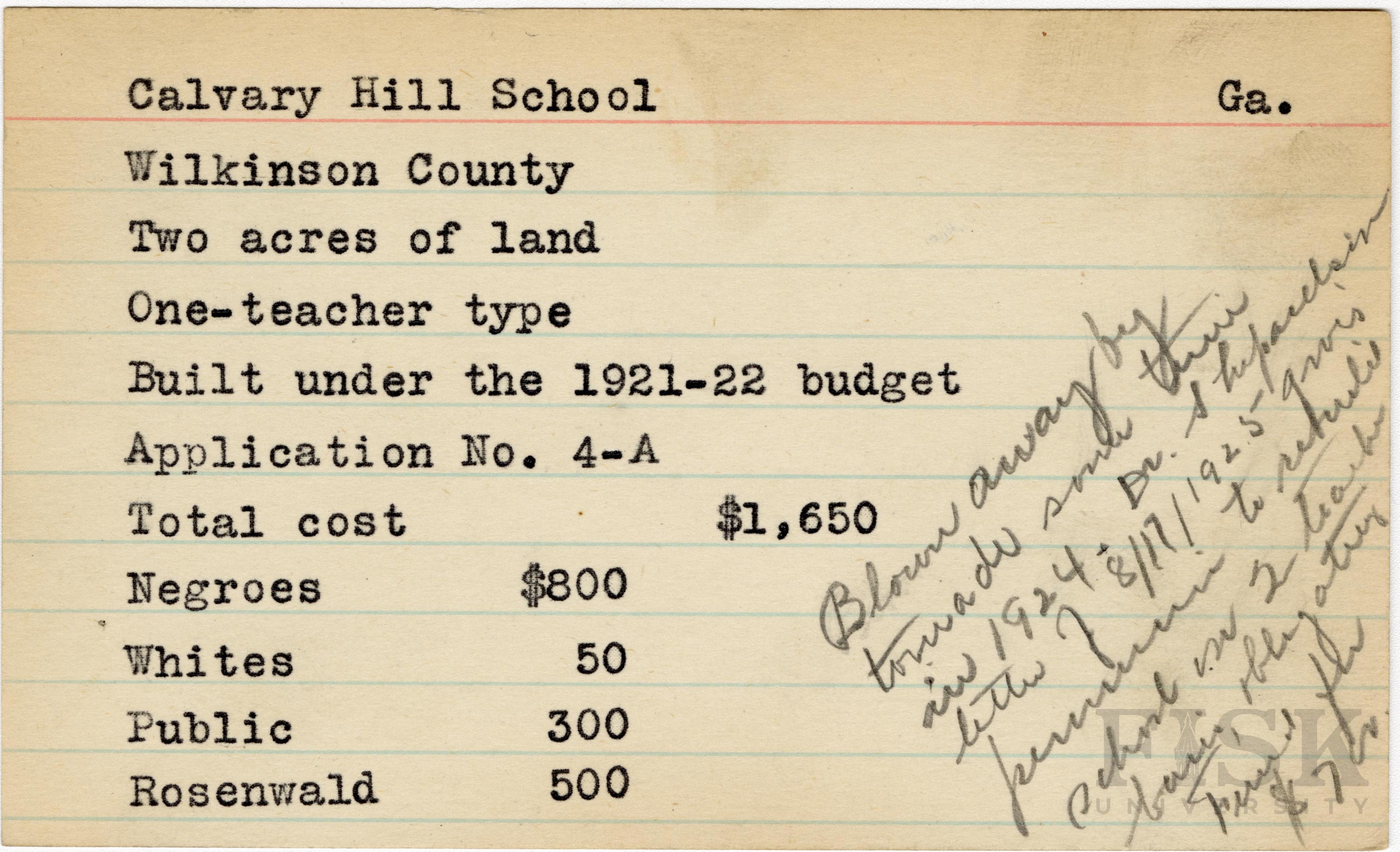 School card from Rosenwald Fund for Calvary Hill School in Wilkinson County, Georgia with a handwritten note that says, "Blown away by tornado some time in 1924. Dr. Shepardain(?) letter of 8/17/1925 gives permission to rebuild school in 2 teacher [unclear], obligatory Fund for $700"