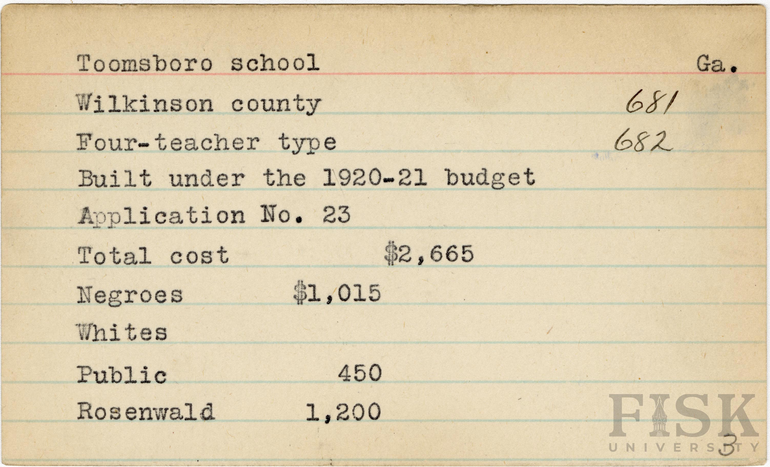 - School card from Rosenwald Fund for Toomsboro School in Wilkinson County, Georgia