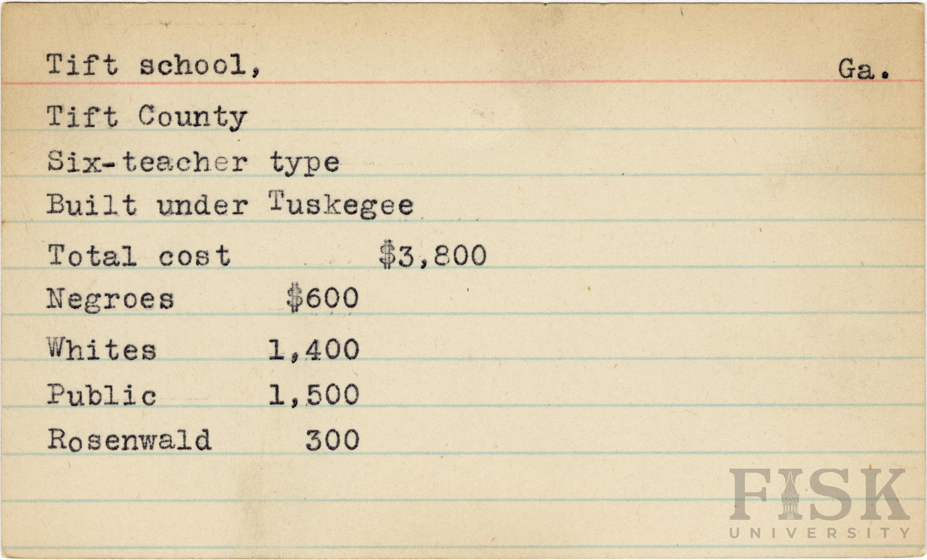 - School card from Rosenwald Fund for Tift School in Tift County, Georgia