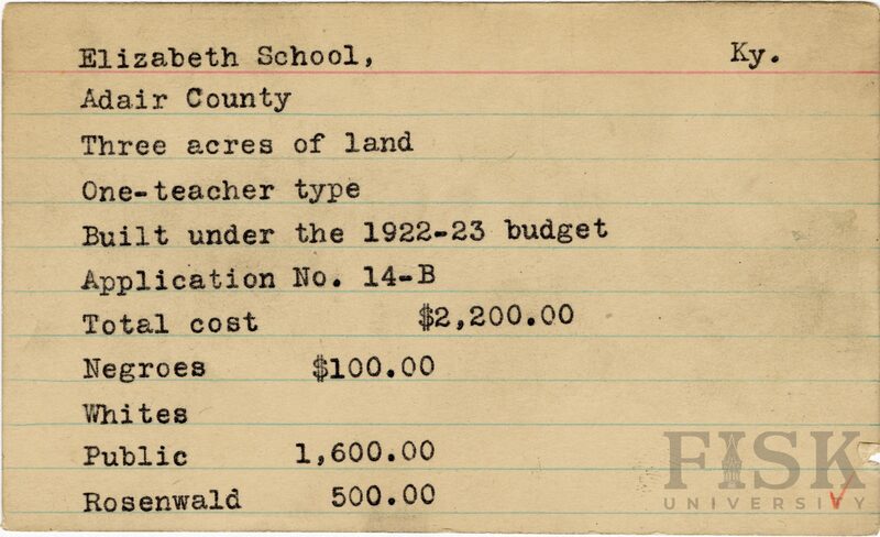 - School card from Rosenwald Fund for Elizabeth School in Adair County, Kentucky