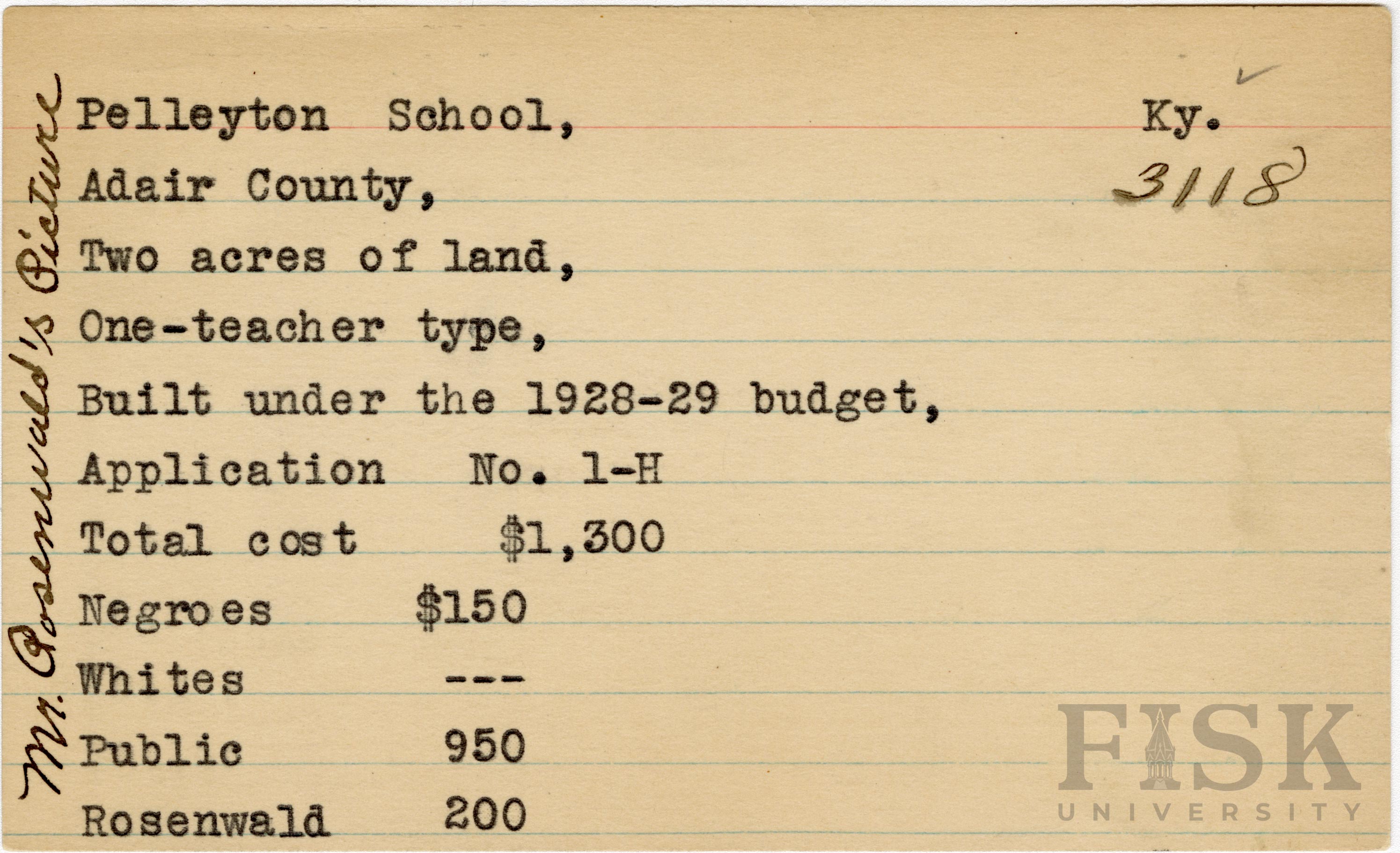 - School card from Rosenwald Fund for Pelleyton School in Adair County, Kentucky with a handwritten note on the far left of the card that says, "Mr. Rosenwald's Picture"