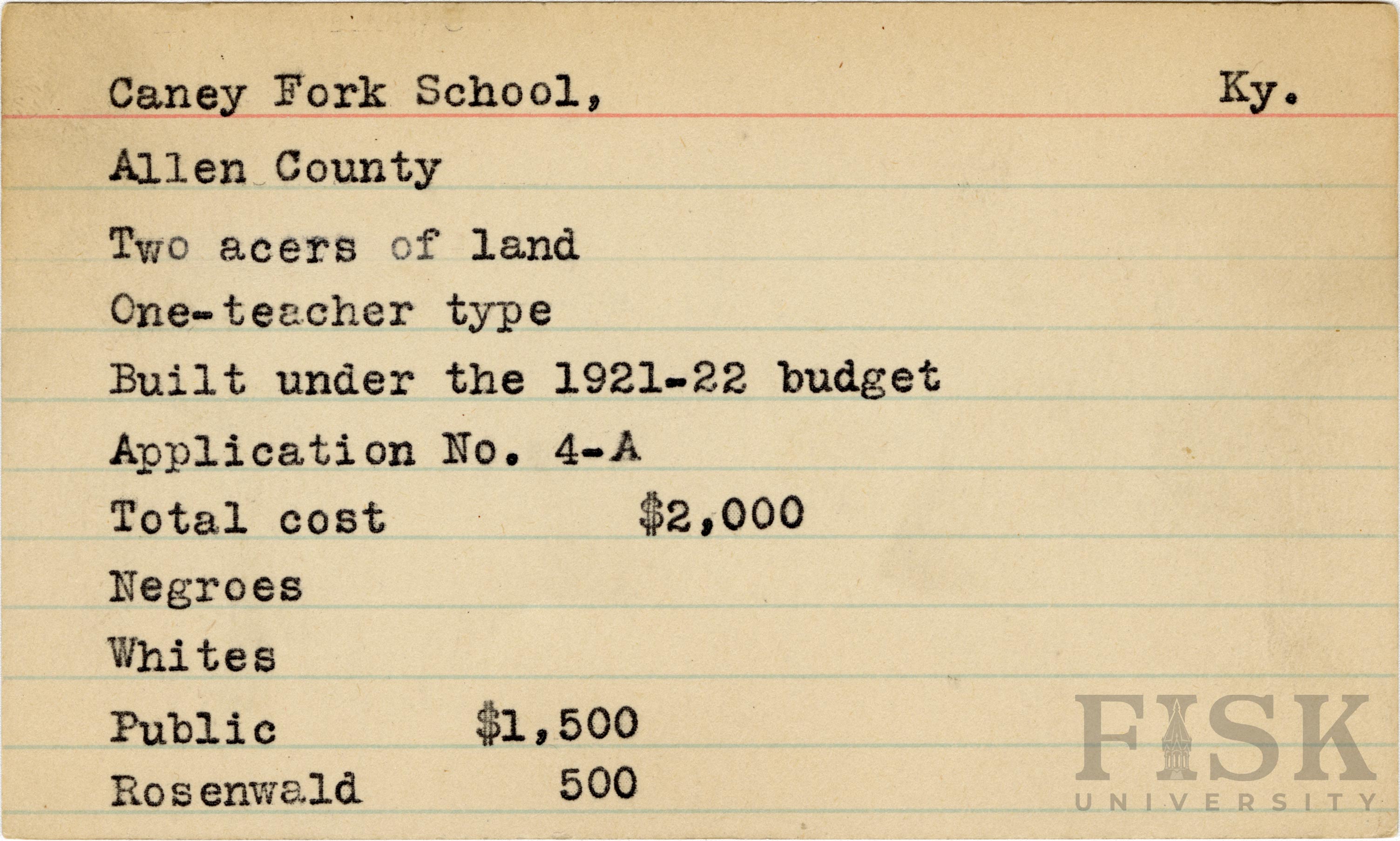 - School card from Rosenwald Fund for Caney Fork School in Allen County, Kentucky