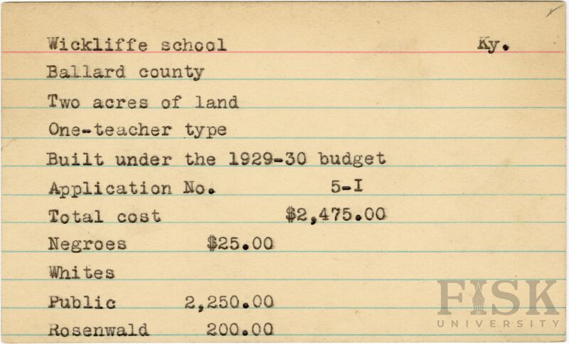 - School card from Rosenwald Fund for Wickliffe School in Ballard County, Kentucky