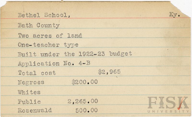 - School card from Rosenwald Fund for Bethel School in Bath County, Kentucky