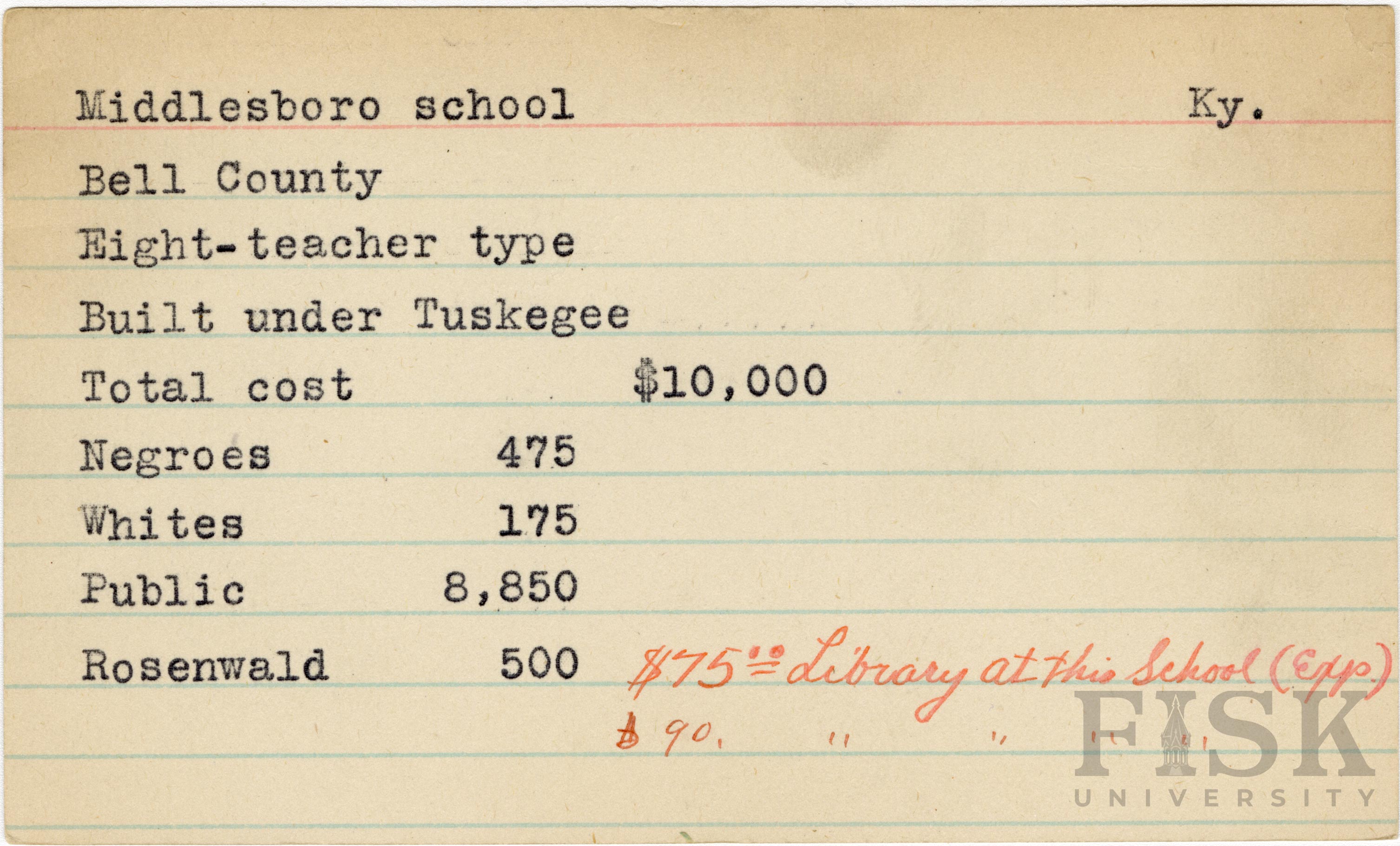 School card from Rosenwald Fund for Middlesboro School in Bell County, Kentucky with handwritten notes that say, "$75.00 library at this school (Exp)" and "$90 library at this school"