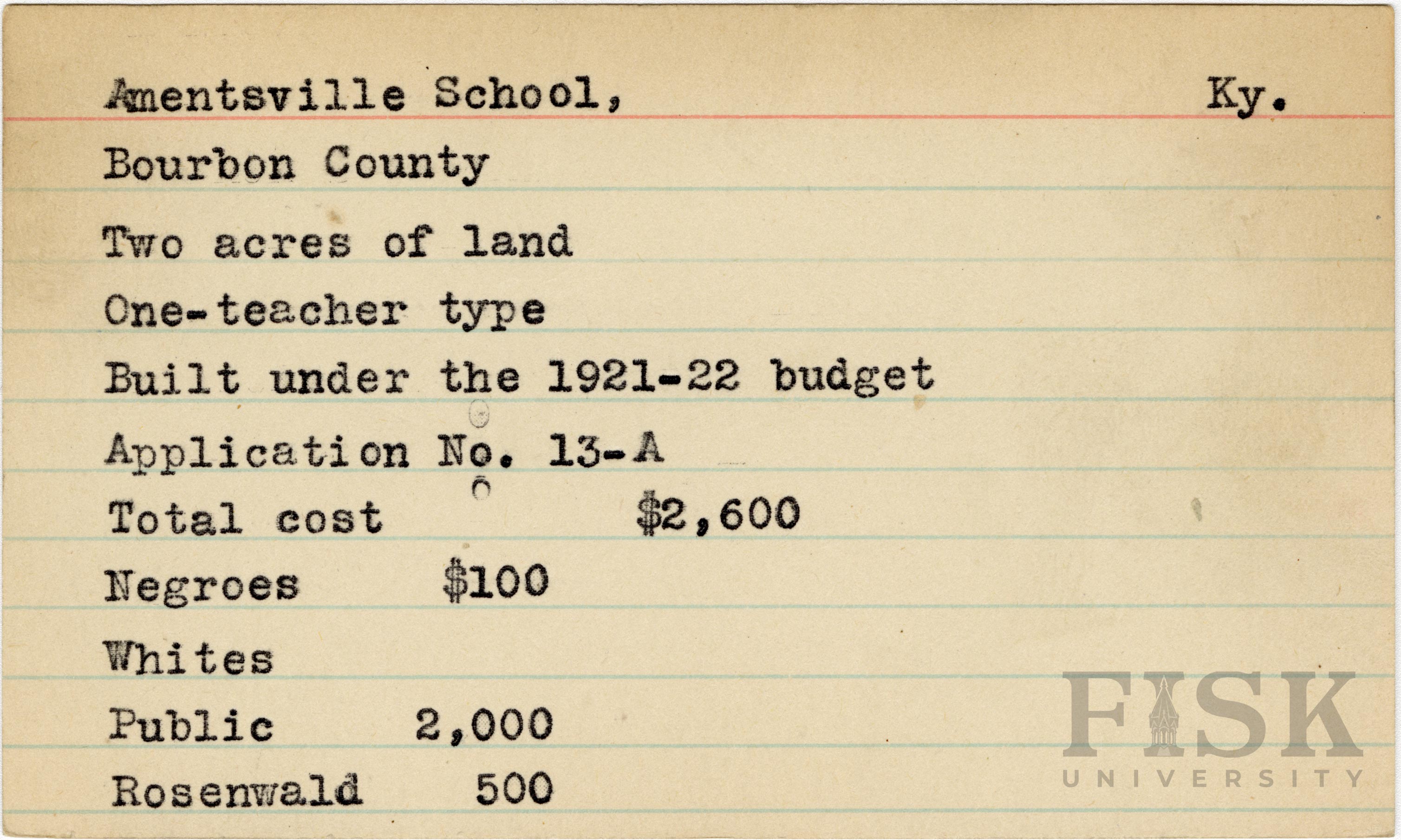 - School card from Rosenwald Fund for Amentsville School in Bourbon County, Kentucky