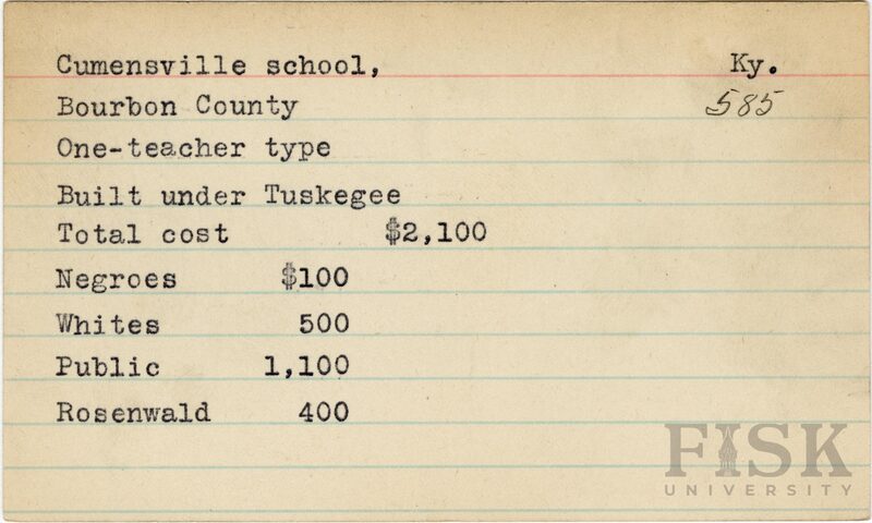 - School card from Rosenwald Fund for Cumensville School in Bourbon County, Kentucky