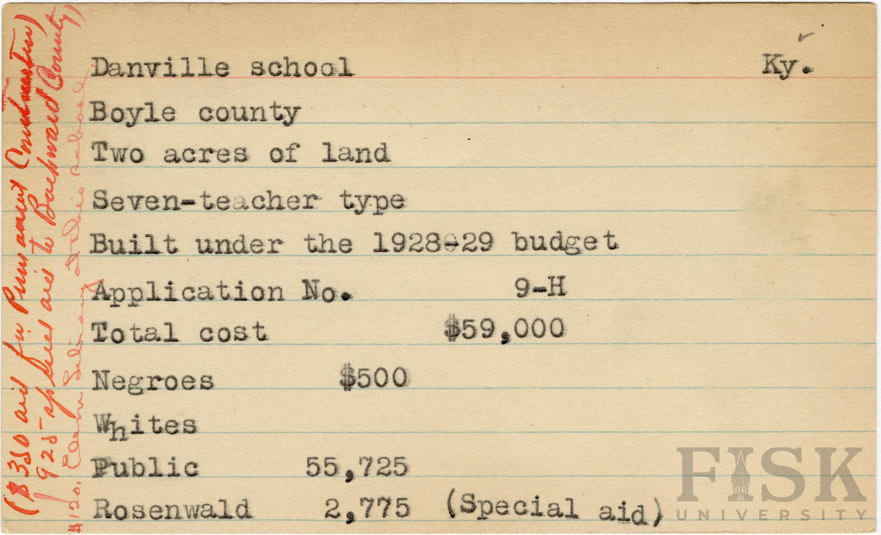 School card from Rosenwald Fund for Danville School in Boyle County, Kentucky with a note next to the Rosenwald budget contribution that says, "(Special aid)". Handwritten notes on the far left of the card say, "($350 aid for Permanent Construction)", "$925 special aid for Backward County", and "$120 elem library at this school"