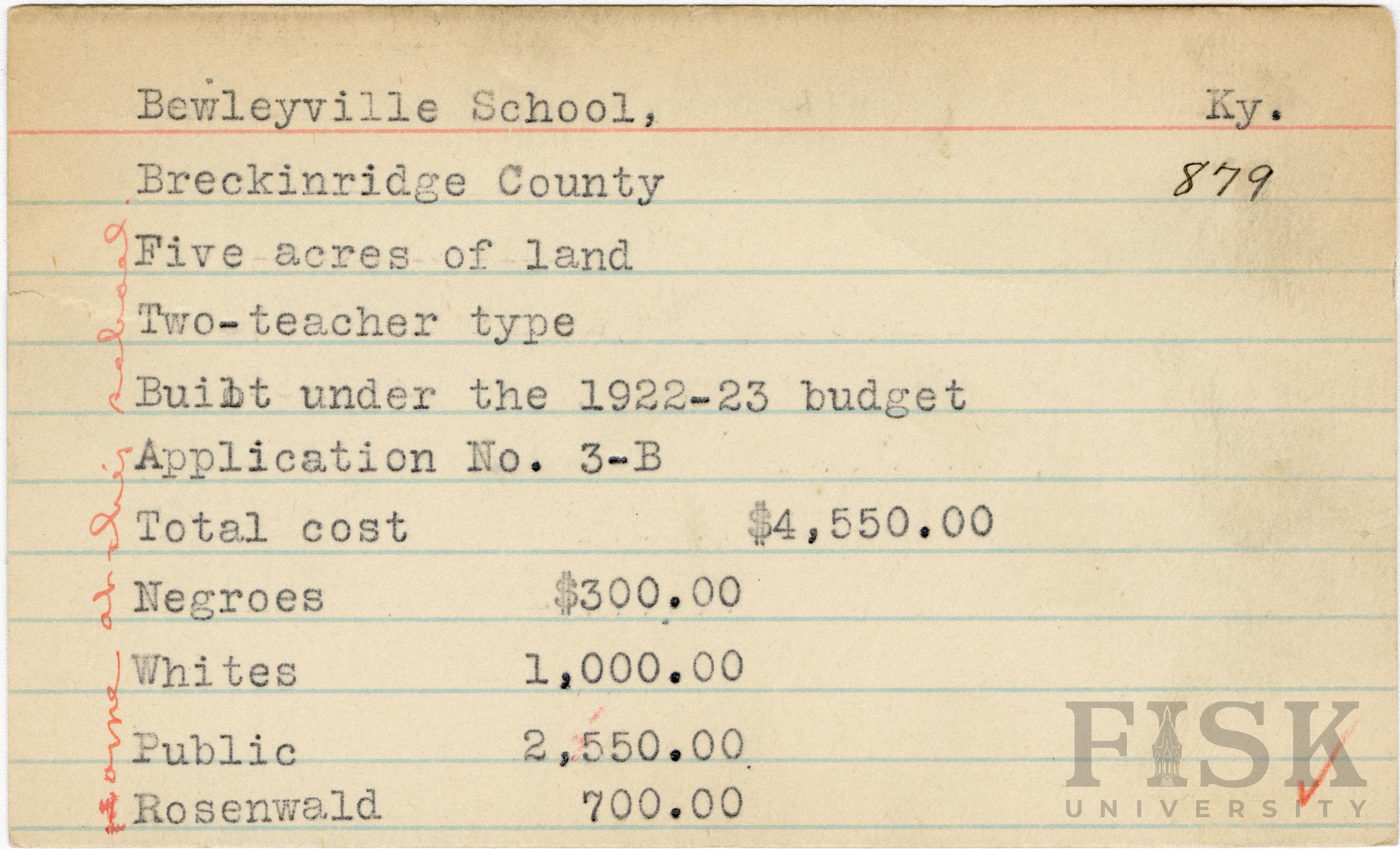 - School card from Rosenwald Fund for Bewleyville School in Breckinridge County, Kentucky with a handwritten note on the far left of the card that says, "Home at this school"