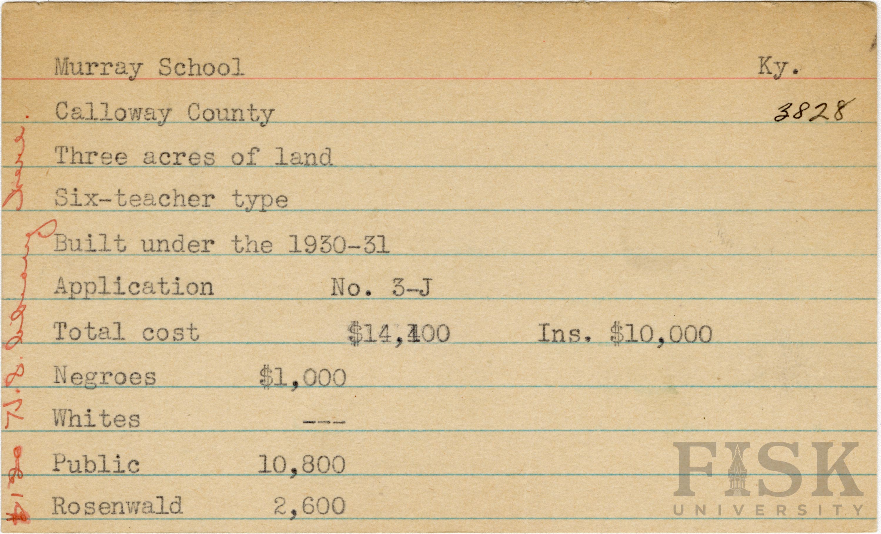 - School card from Rosenwald Fund for Murray School in Calloway County, Kentucky with a section added to the budget contributions that says, "Ins. $10,000" and a handwritten note on the far left of the card that says, "$120 H.S. library here"