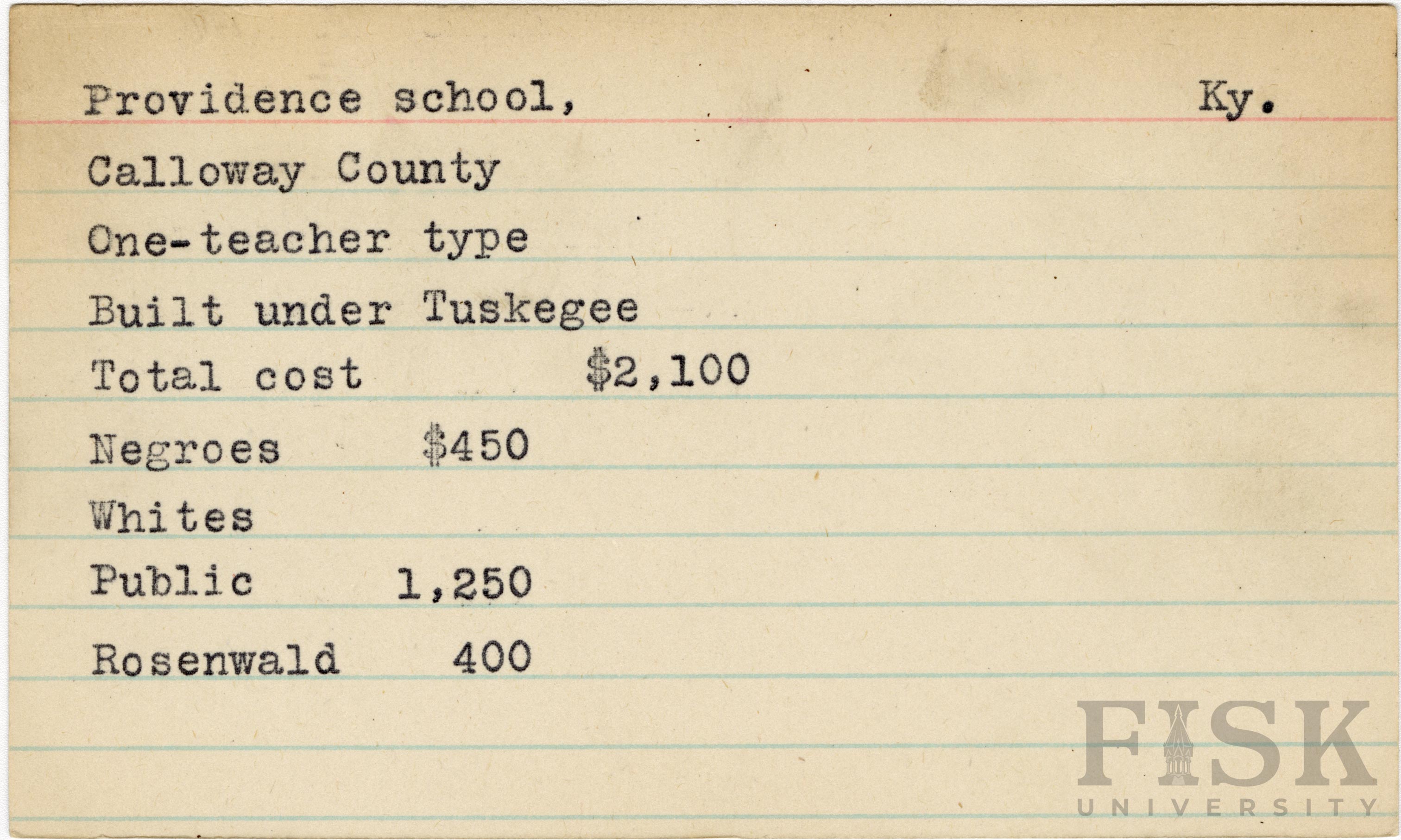 School card from Rosenwald Fund for Providence School in Calloway County, Kentucky