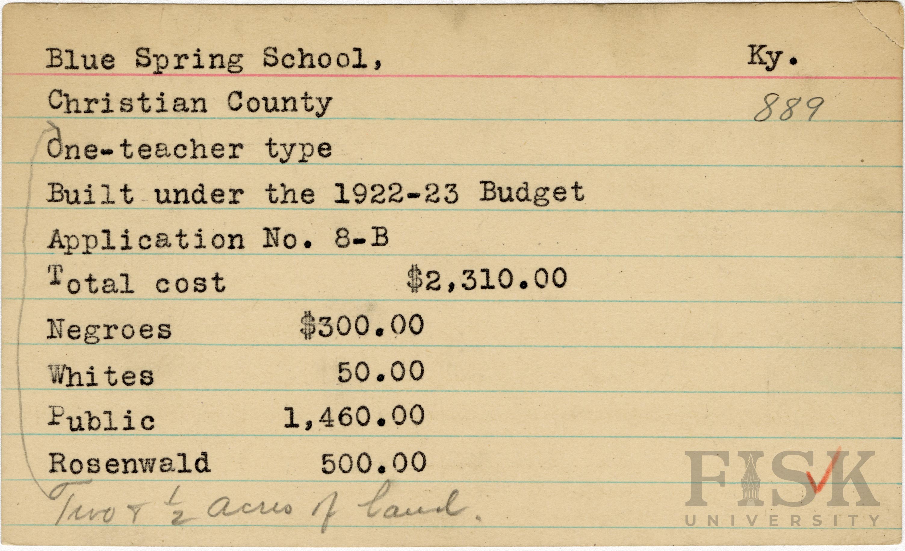 - School card from Rosenwald Fund for Blue Spring School in Christian County, Kentucky