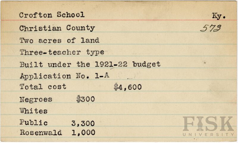 - School card from Rosenwald Fund for Crofton School in Christian County, Kentucky