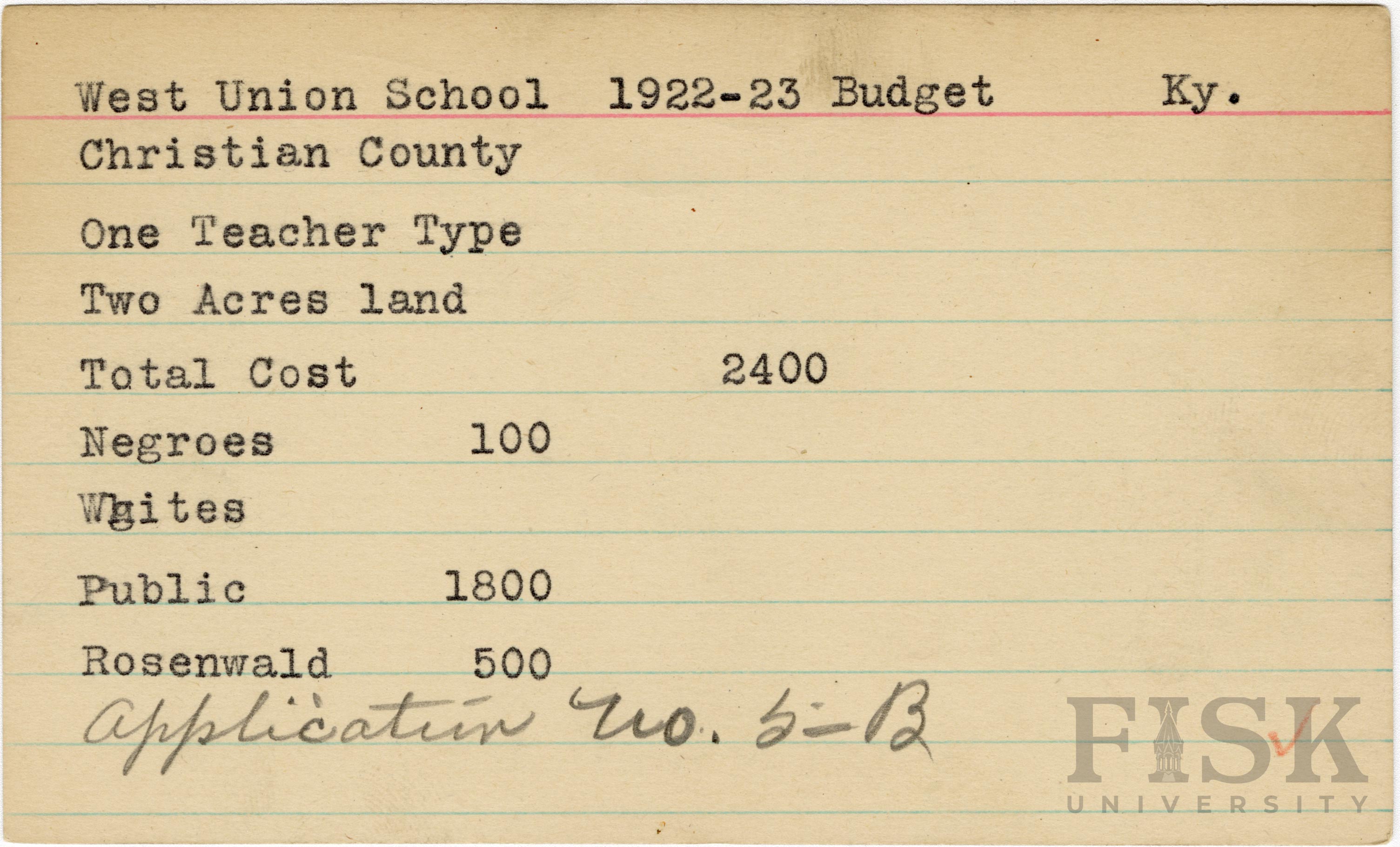 - School card from Rosenwald Fund for West Union School in Christian County, Kentucky