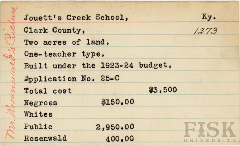 - School card from Rosenwald Fund for Jouett's Creek School in Clark County, Kentucky with a handwritten note on the far left of the card that says, "Mr. Rosenwald's Picture"