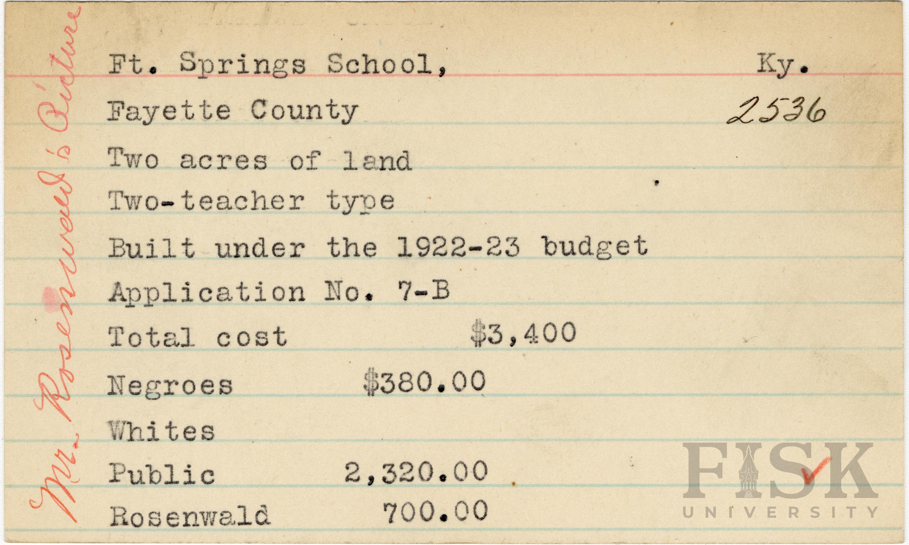 School card from Rosenwald Fund for Ft. Springs School in Fayette County, Kentucky with a handwritten note on the far left of the card that says, "Mr. Rosenwald's Picture"