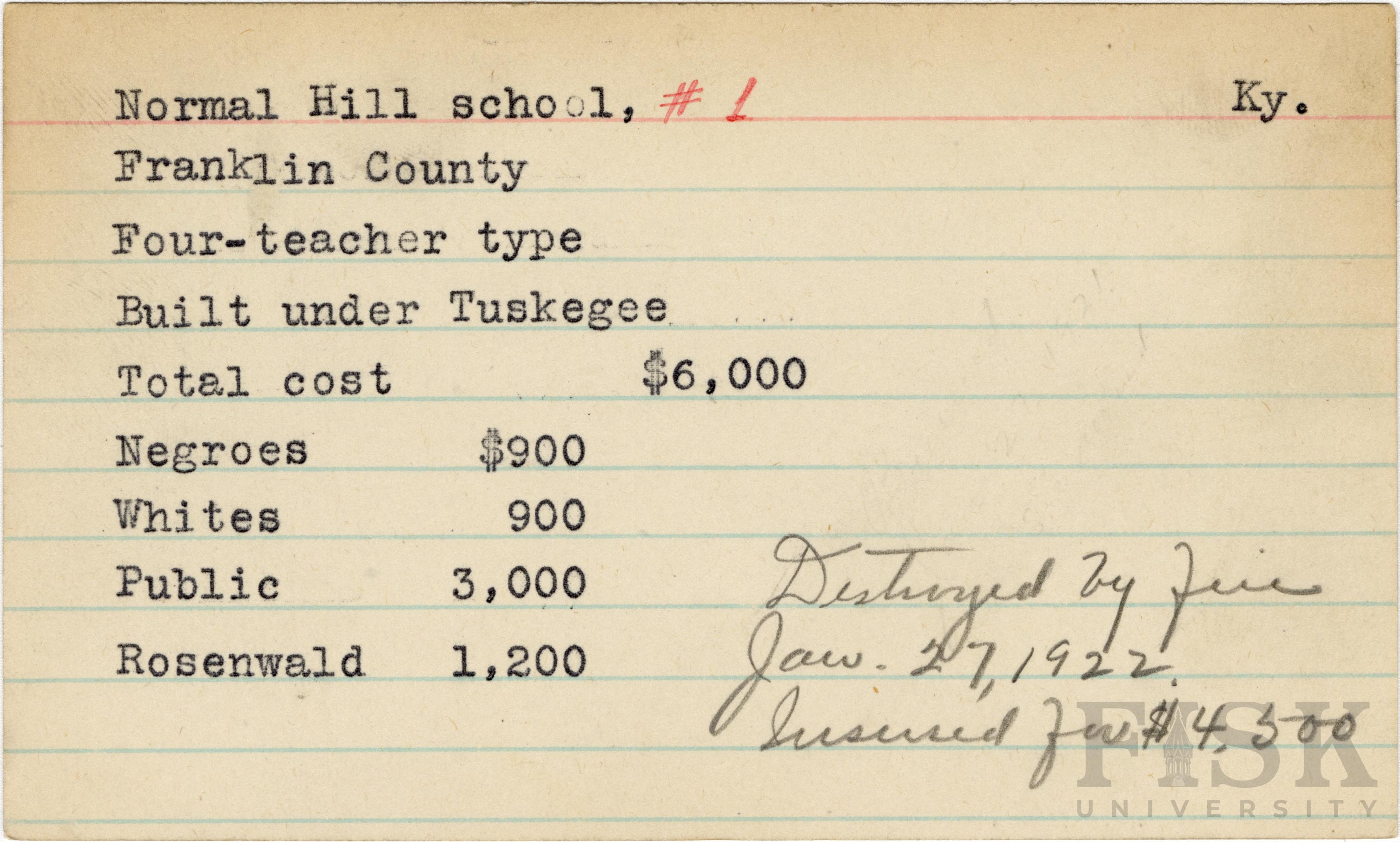 School card from Rosenwald Fund for Normal Hill School No. 1 in Franklin County, Kentucky with a handwritten note that says, "Destroyed by fire, Jan. 27, 1922, Insured for $4,500"