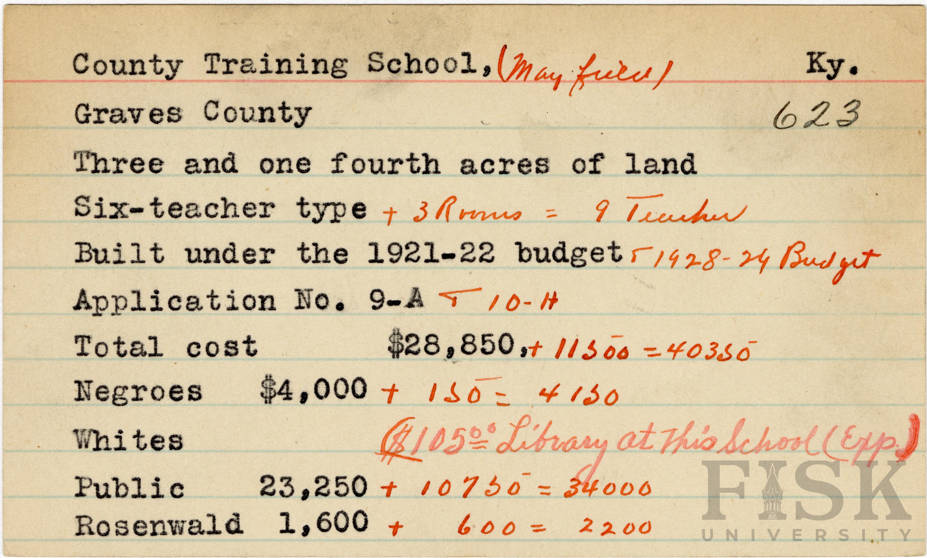 - School card from Rosenwald Fund for County Training School in Graves County, Kentucky with handwritten additions to the teacher type, budget year, application number, and budget contribution sections. A handwritten note says, "$105.00 library at this school (Exp)"