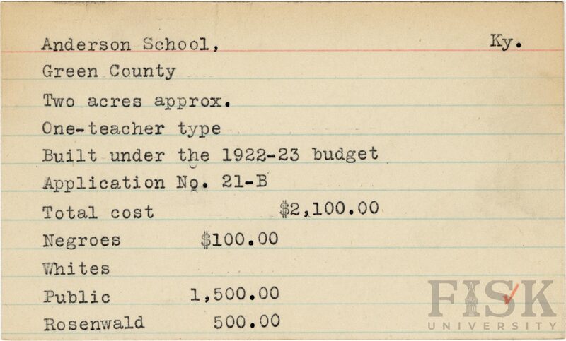 - School card from Rosenwald Fund for Anderson School in Green County, Kentucky