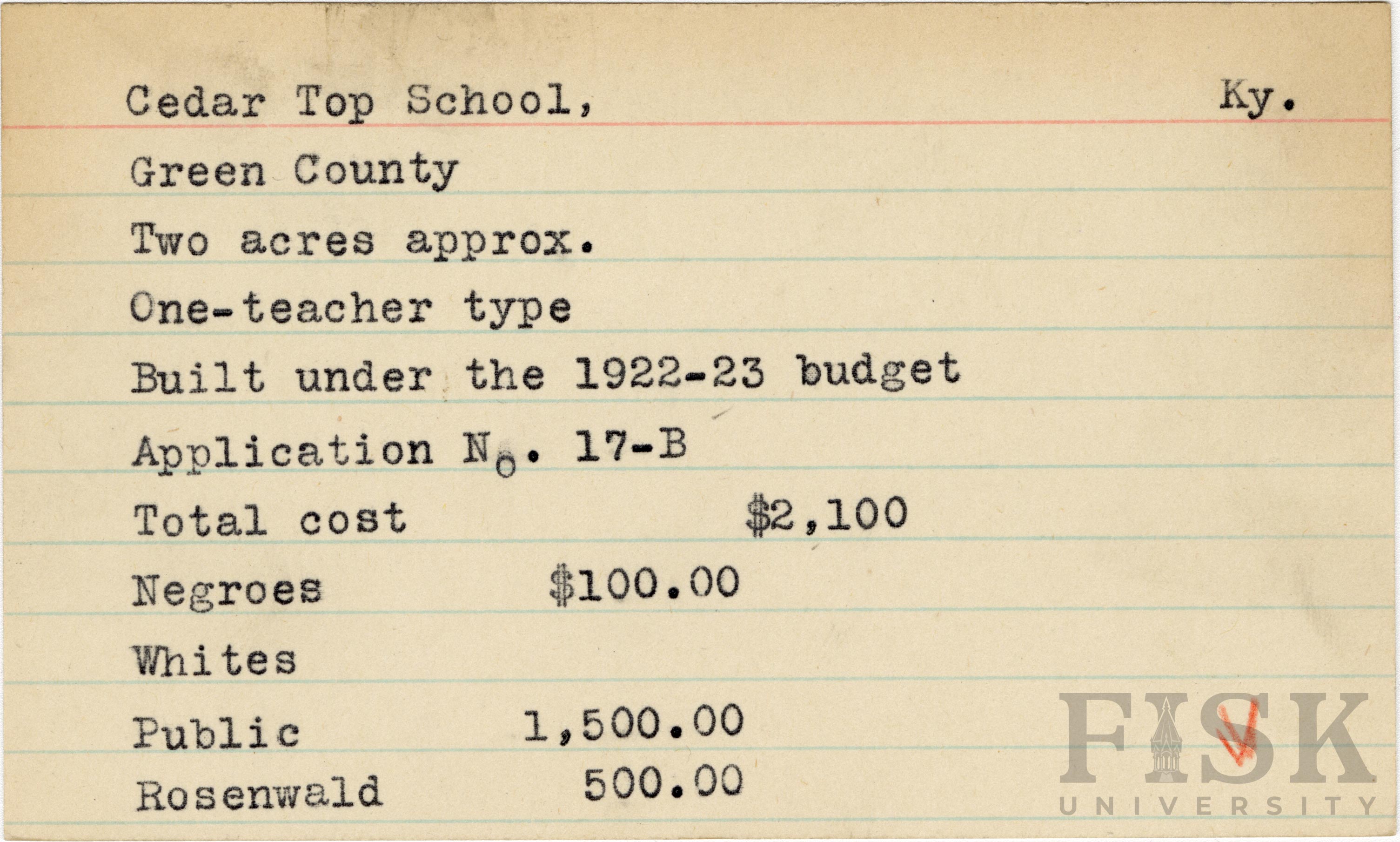 - School card from Rosenwald Fund for Cedar Top School in Green County, Kentucky