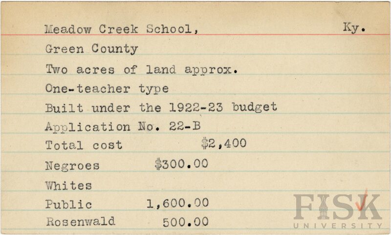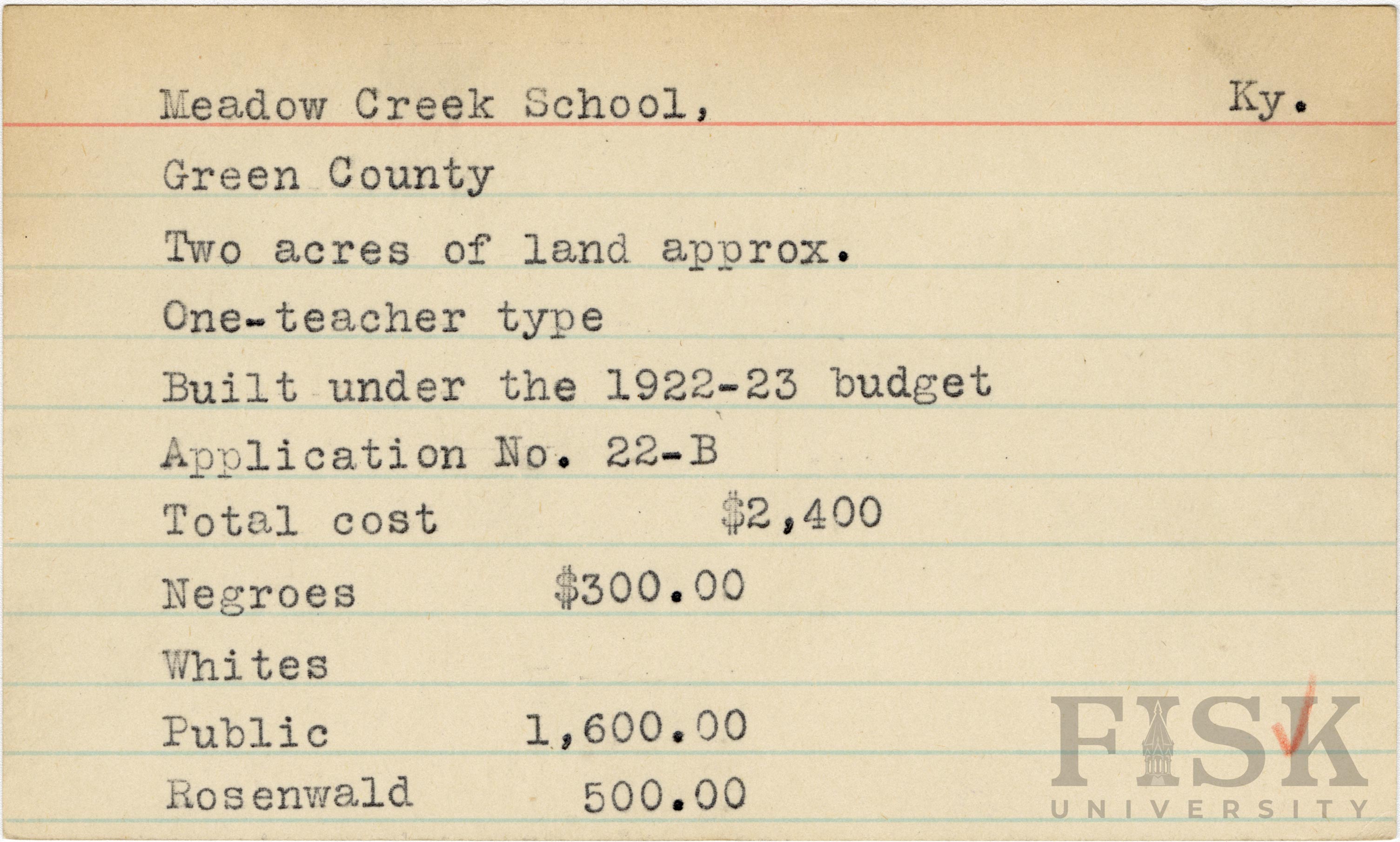 - School card from Rosenwald Fund for Meadow Creek School in Green County, Kentucky