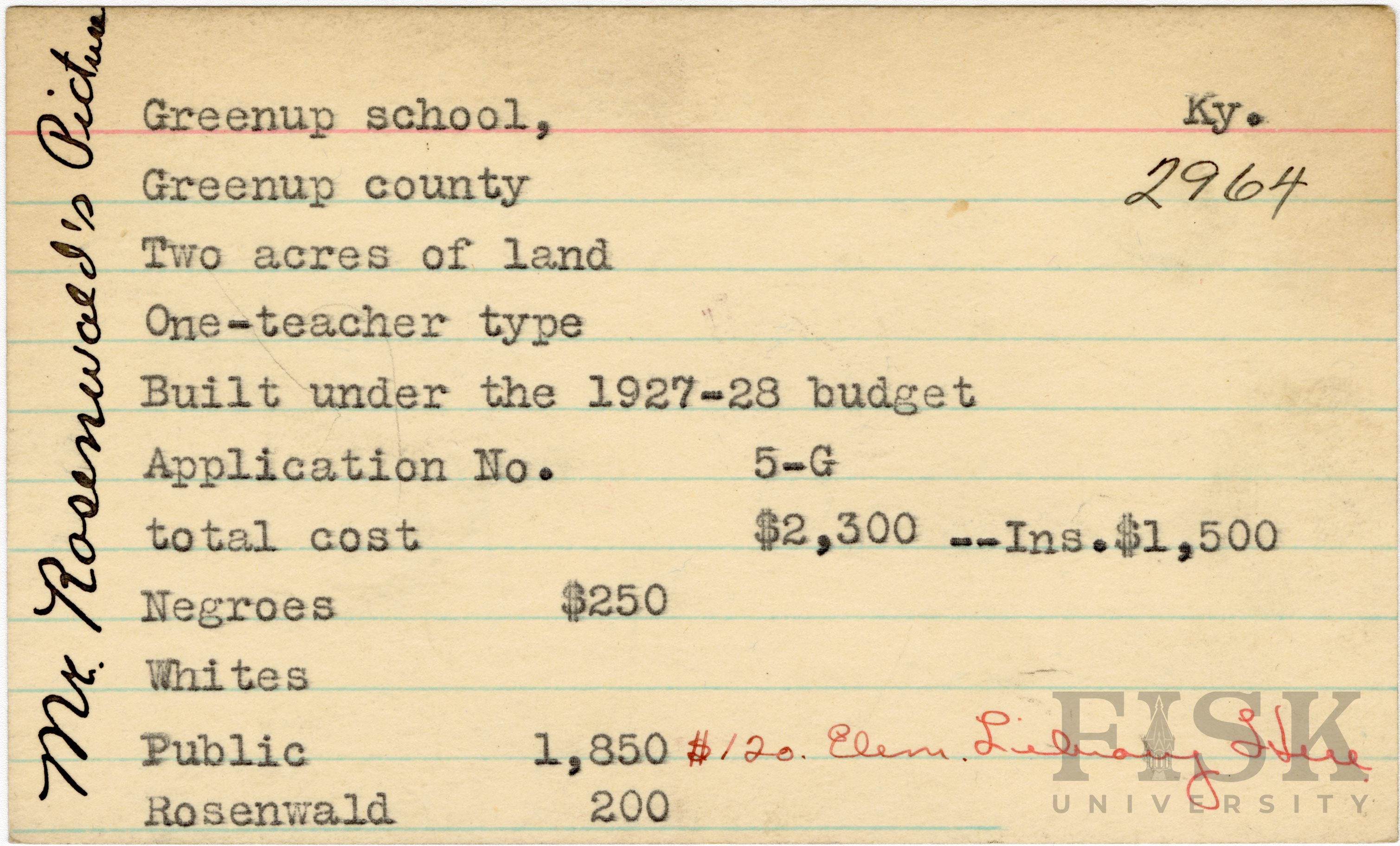 - School card from Rosenwald Fund for Greenup School in Greenup County, Kentucky with a section added to the budget contributions that says, "Ins. $1,500". Handwritten notes on the card say, "Mr. Rosenwald's Picture" and "$120 elem library here"