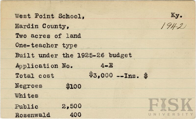 - School card from Rosenwald Fund for West Point School in Hardin County, Kentucky