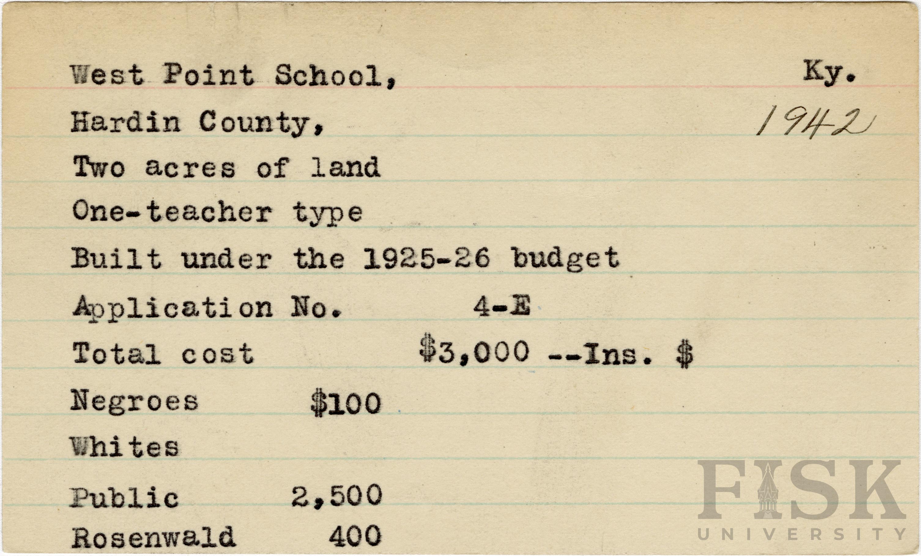 School card from Rosenwald Fund for West Point School in Hardin County, Kentucky