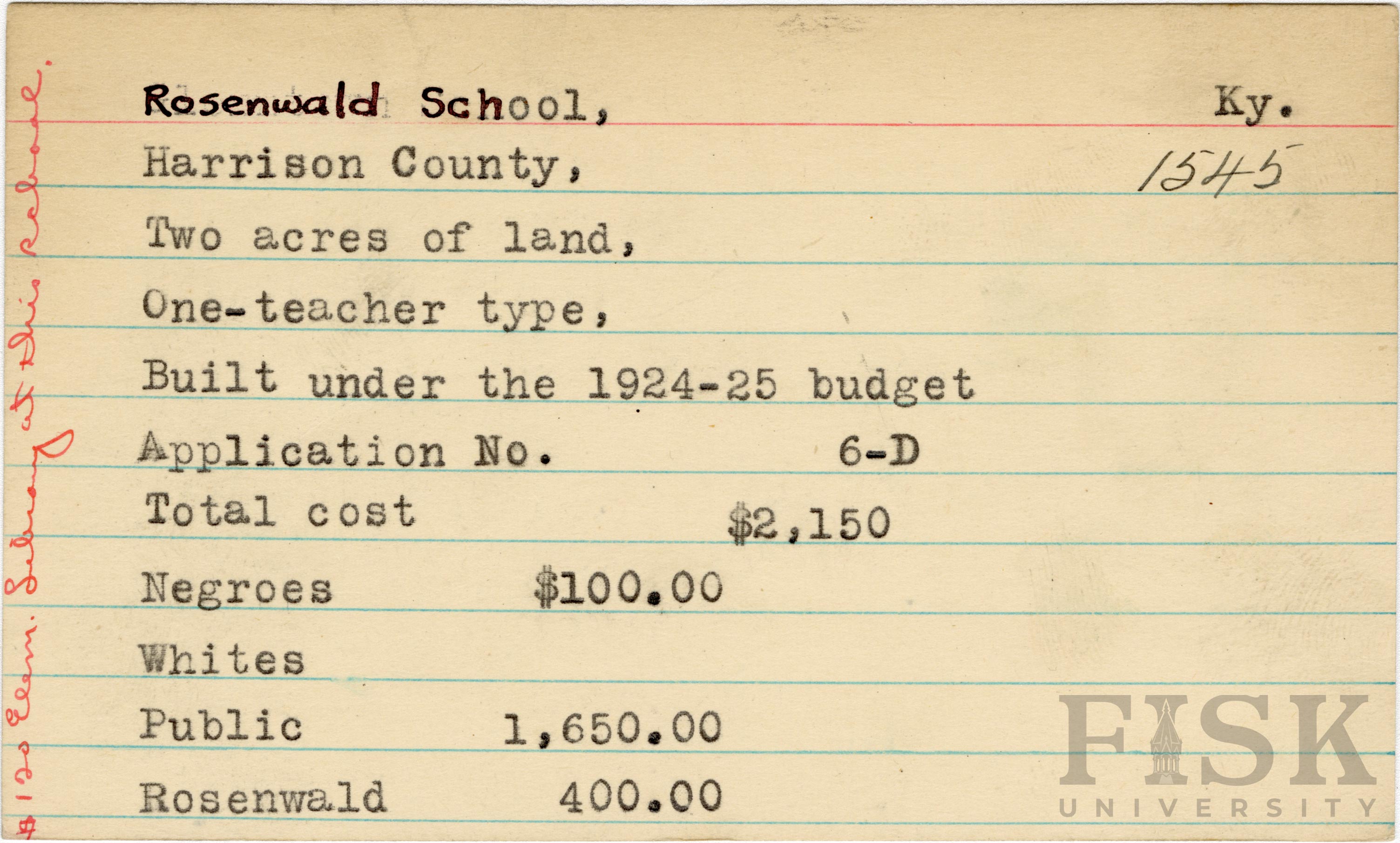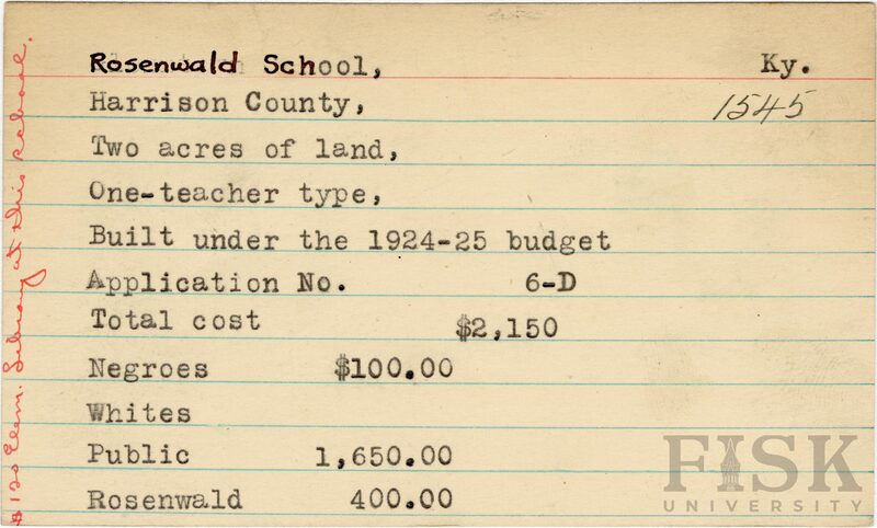 - School card from Rosenwald Fund for Rosenwald School in Harrison County, Kentucky with a handwritten note on the far left of the card that says, "$120 elem library at this school"