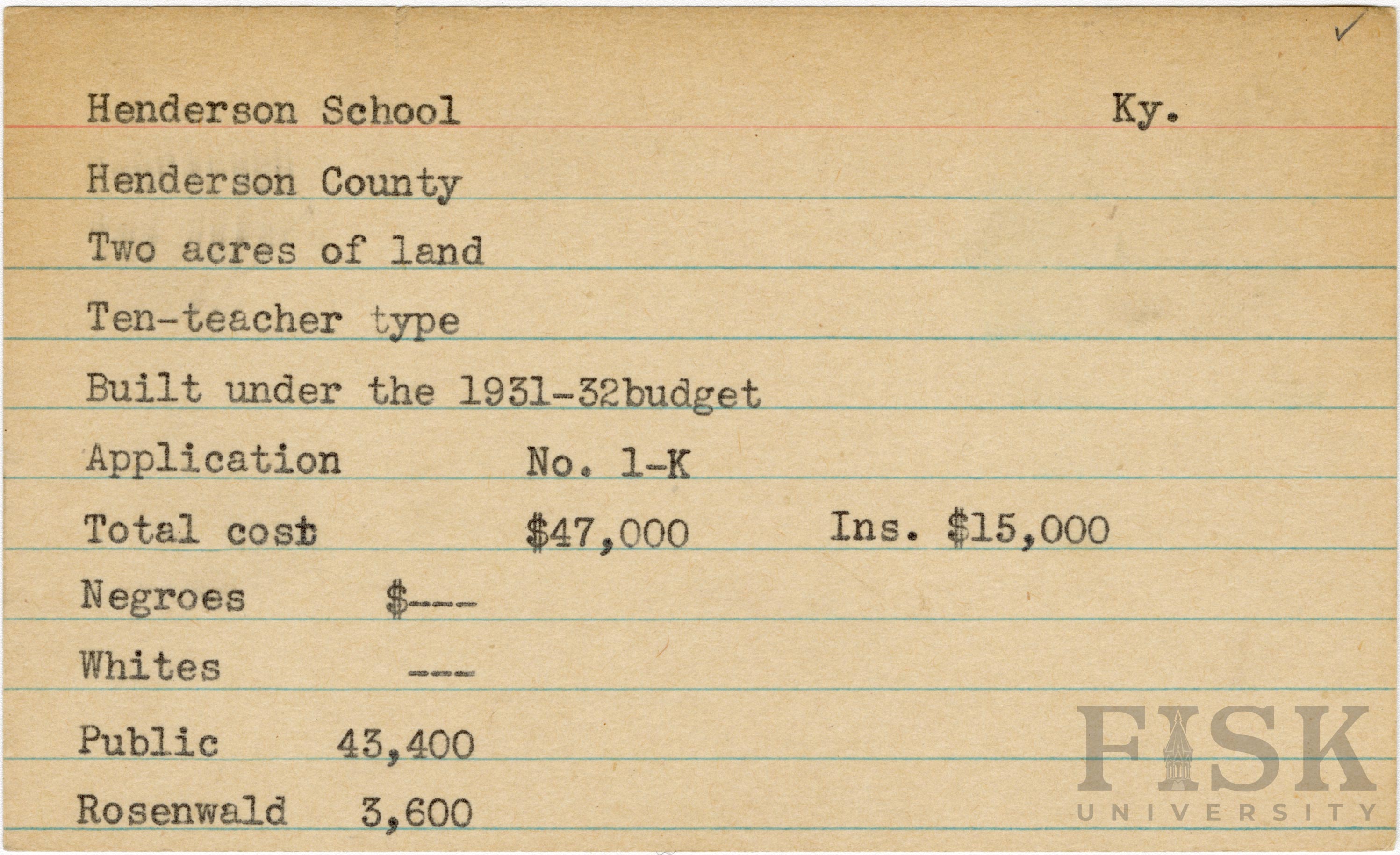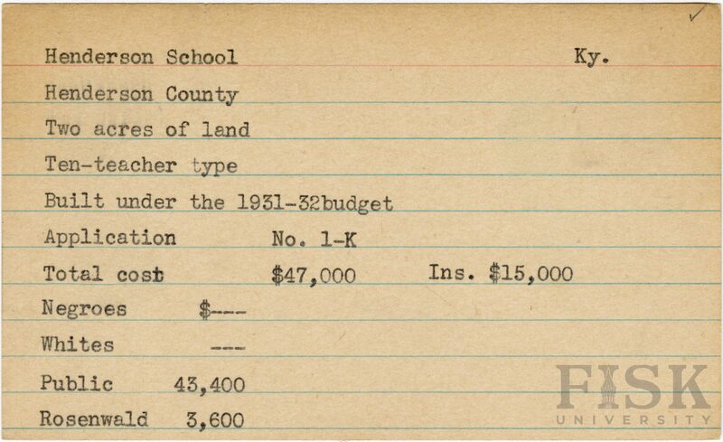 School card from Rosenwald Fund for Henderson School in Henderson County, Kentucky with a section added to the budget contributions that says, "Ins. $15,000"