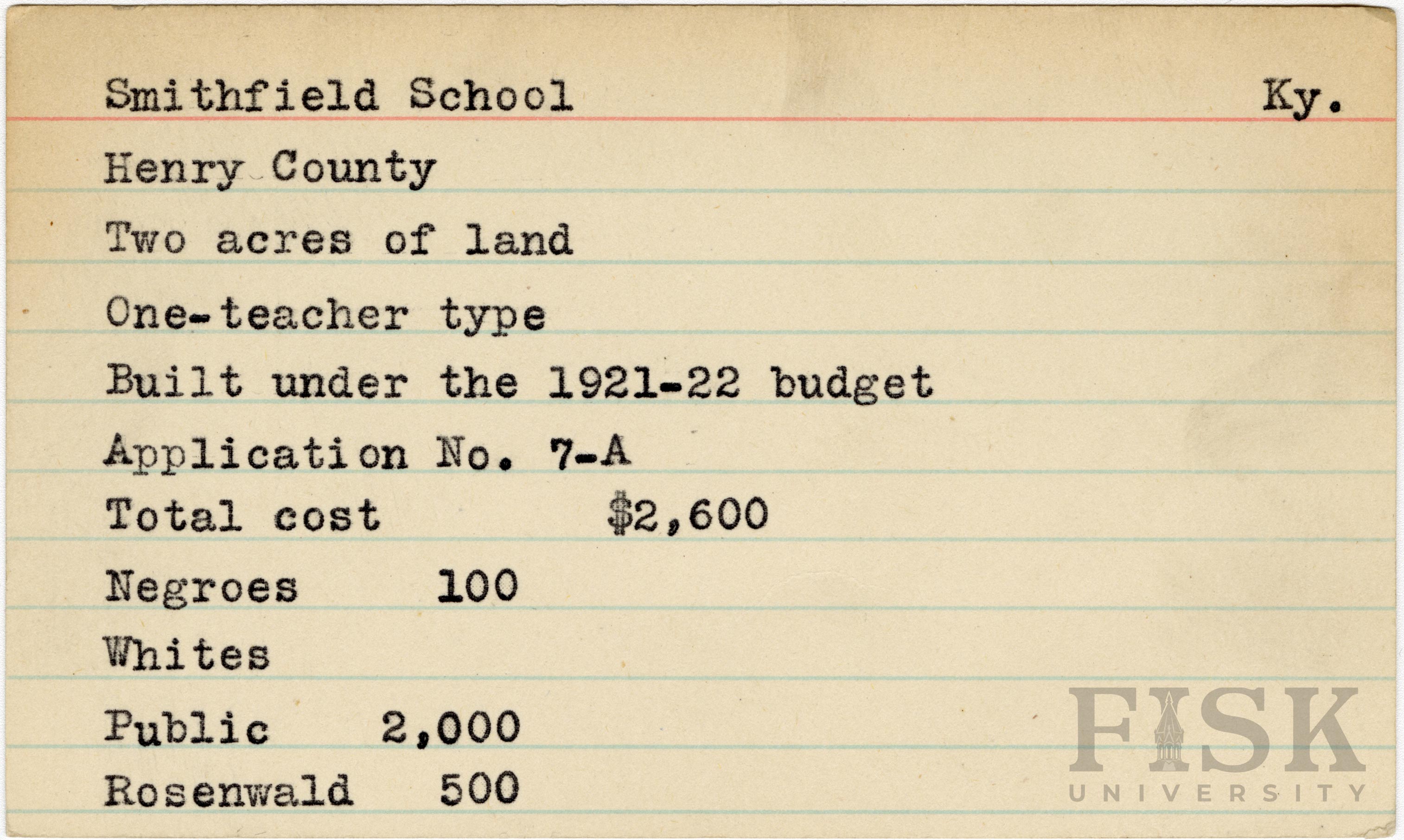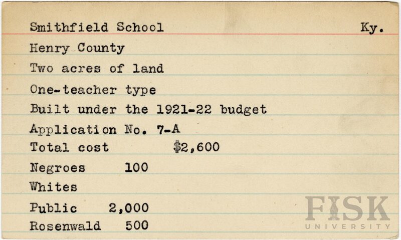 - School card from Rosenwald Fund for Smithfield School in Henry County, Kentucky